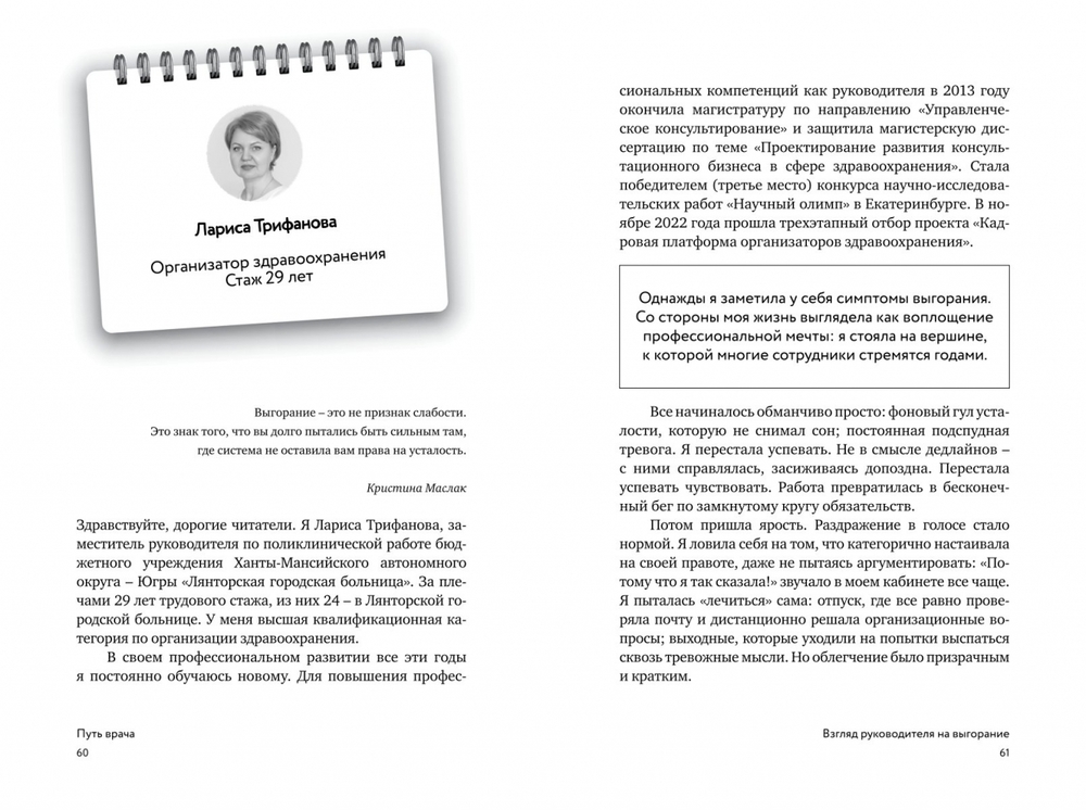 В новой книге практикующие врачи разных специальностей – терапевты, кардиологи, неонатологи, координаторы здравоохранения и многие другие впервые откровенно делятся тем, как столкнулись с профессиональным выгоранием и что именно помогло им справиться с внутренними кризисами и выстроить практику так, чтобы сохранить радость и силу профессии.
