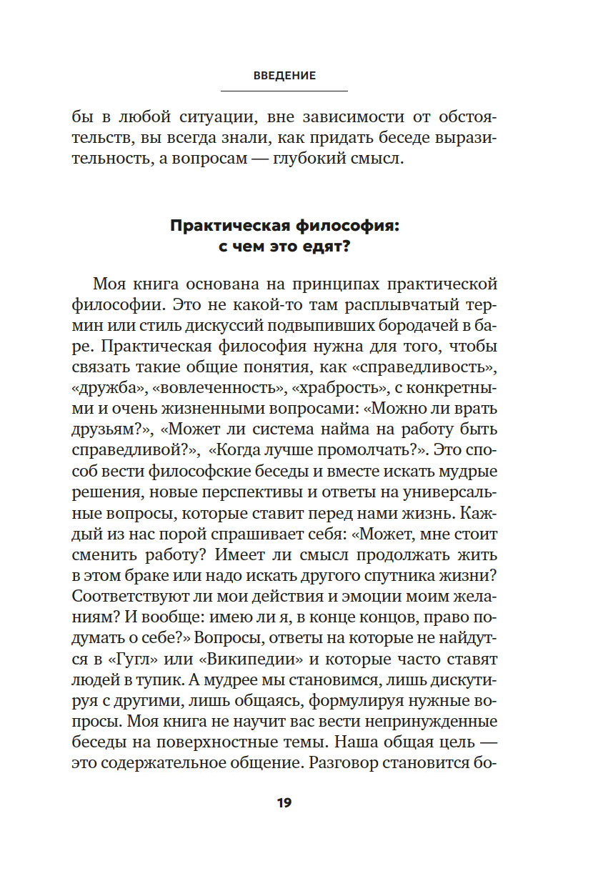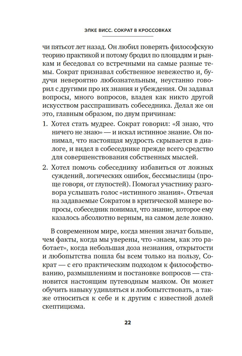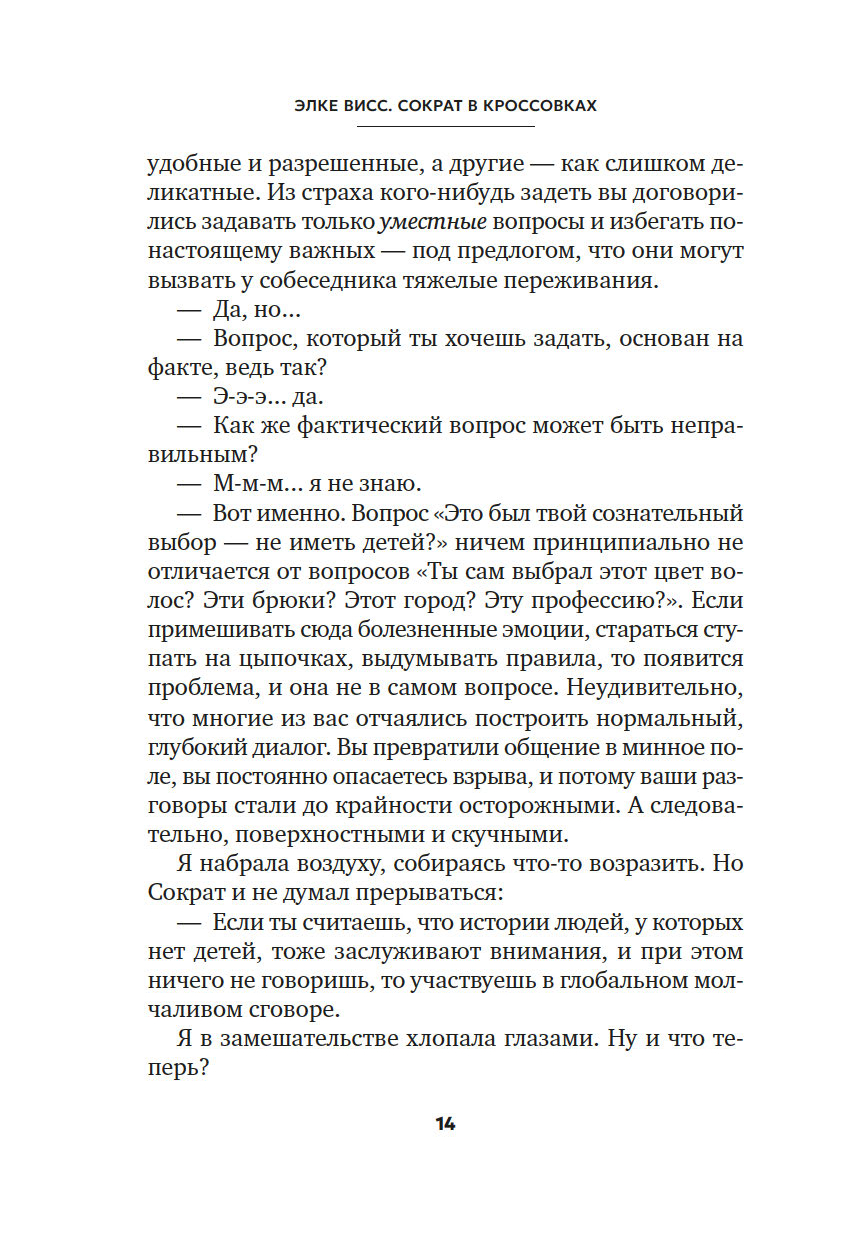 В современном мире искусство вести беседу (будь то разговор с близким человеком или деловые переговоры) играет важную роль. Один из ведущих психологов в Европе Элке Висс предлагает несколько простых и увлекательных методов для улучшения коммуникативных навыков, обращаясь за помощью к блестящему специалисту по диалогам – древнегреческому философу Сократу. Оказывается, его методы ничуть не устарели и по-прежнему могут подарить преданным ученикам счастье и свободу смотреть на мир изумленным, заинтересованным взглядом.