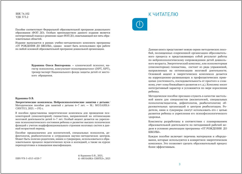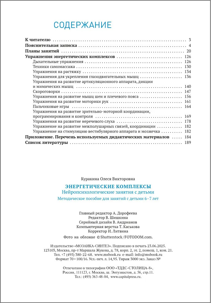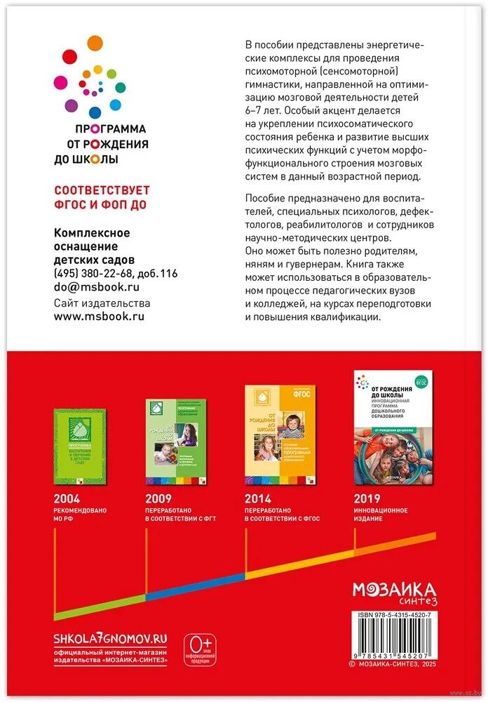 В пособии представлены энергетические комплексы для проведения психомоторной (сенсомоторной) гимнастики, направленной на оптимизацию мозговой деятельности детей 6-7 лет. Особый акцент делается на укреплении психосоматического состояния ребенка и развитие высших психических функций с учетом морфофункционального строения мозговых систем в данный возрастной период.