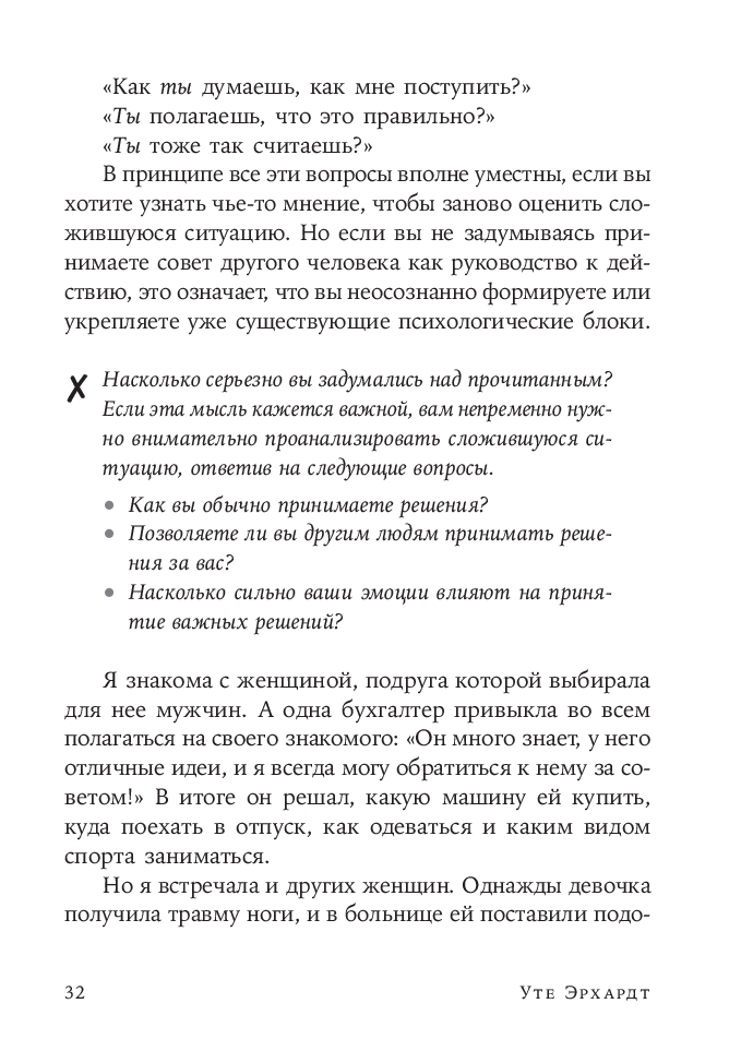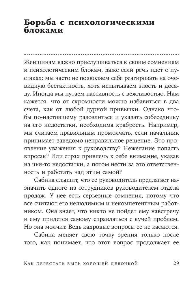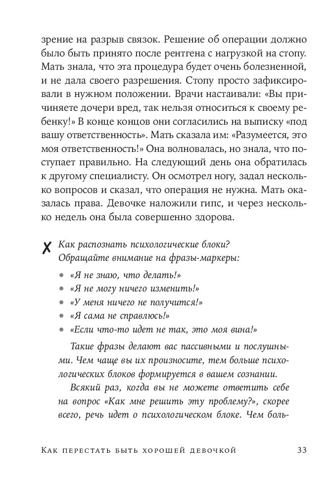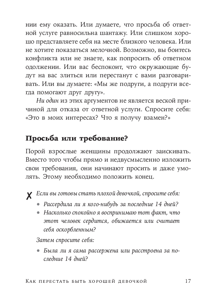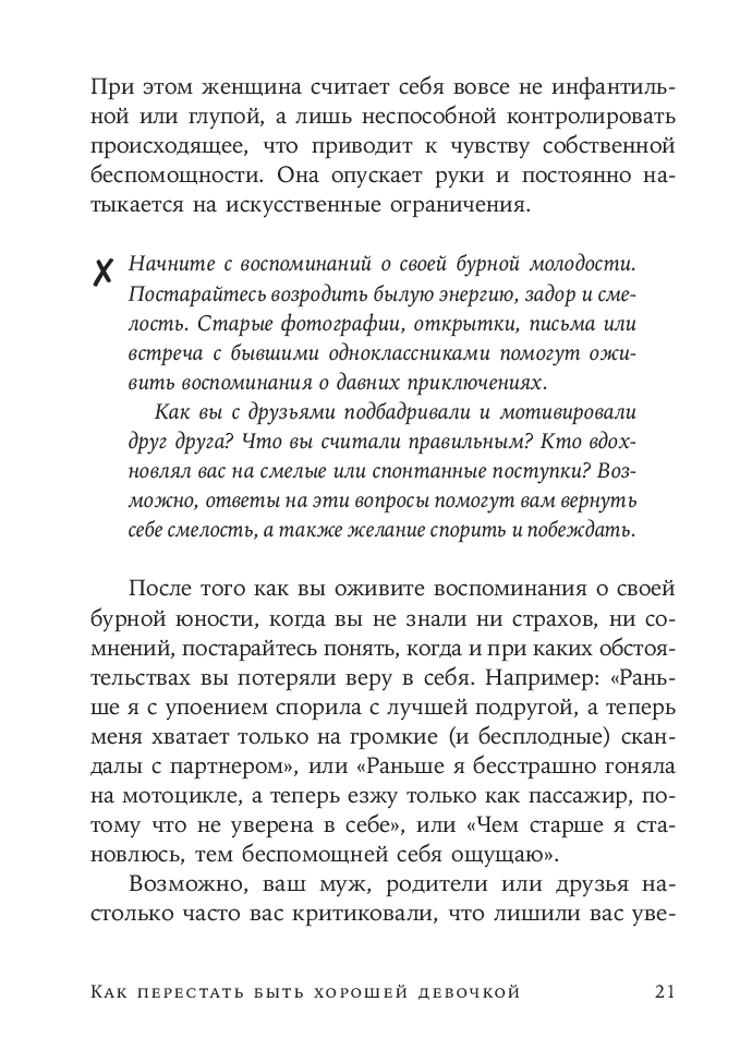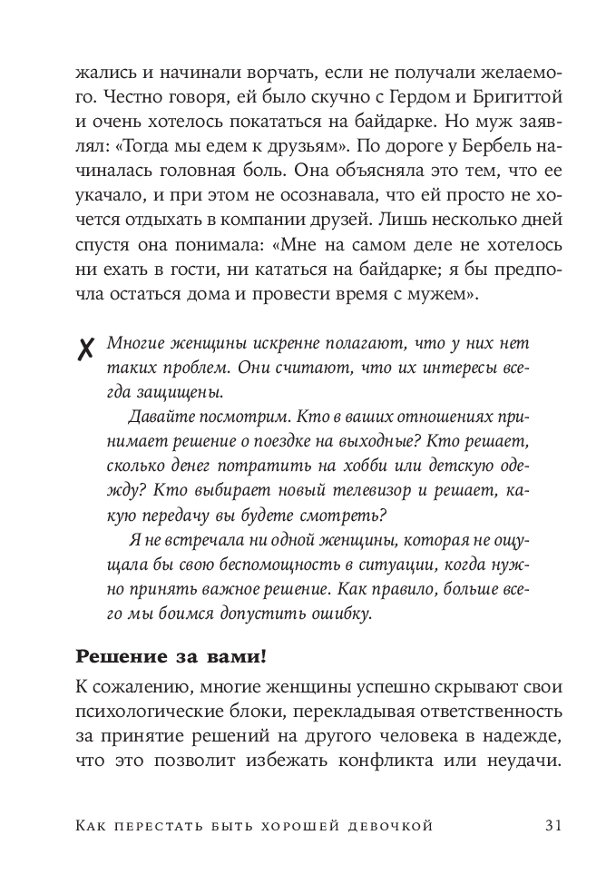 Эта рабочая тетрадь – незаменимый инструмент для всех женщин, стремящихся к внутренней свободе и реализации своих желаний. Автор предлагает практические задания, упражнения и конкретные стратегии, чтобы шаг за шагом перенести теоретические идеи в повседневную жизнь: научиться говорить "нет", отстаивать свои границы, слышать собственные желания и признавать ошибки не как поражение, а как опыт. Практикум охватывает ключевые сферы – отношения, работу, семью, дружбу, помогая распознать распространенные ловушки мышления и избавиться от "комплекса хорошей девочки".