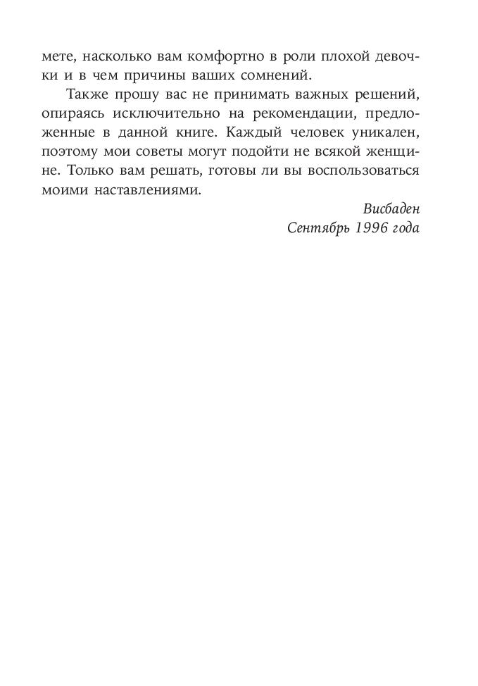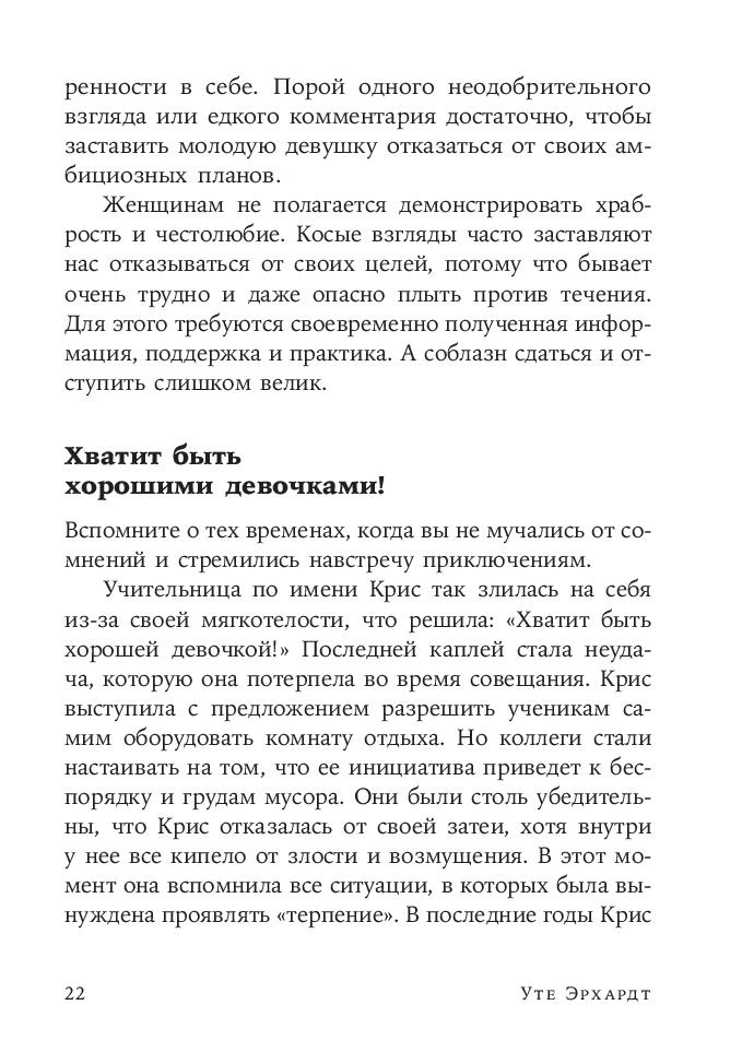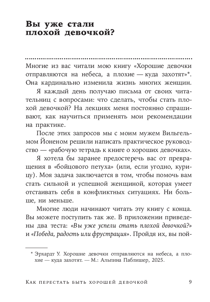 Супербестселлер Уте Эрхардт "Хорошие девочки отправляются на небеса, а плохие – куда захотят" покорил женщин по всему миру и изменил их жизнь к лучшему. Читательницы стали активно обращаться к автору за практической помощью, они просили разъяснить, как последовательно применять идеи ее книги в повседневной жизни. Отсюда и появилось руководство "Как перестать быть хорошей девочкой".