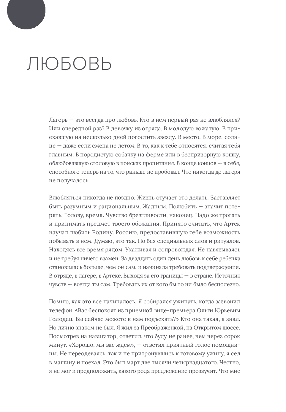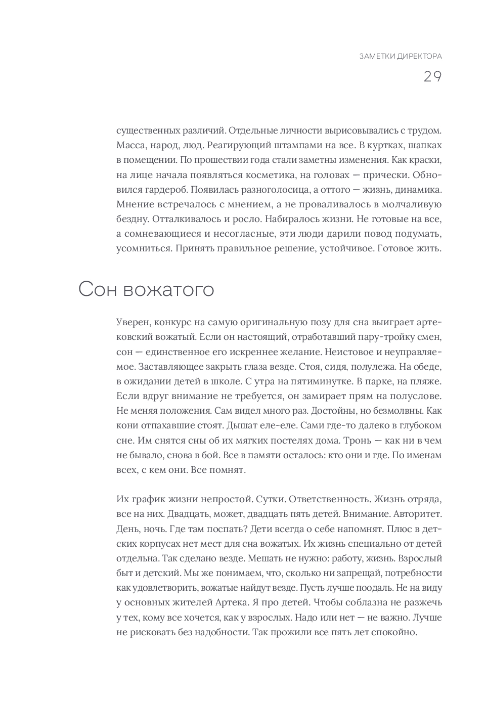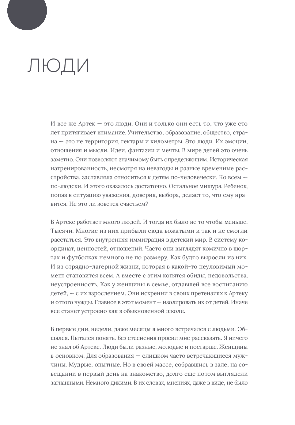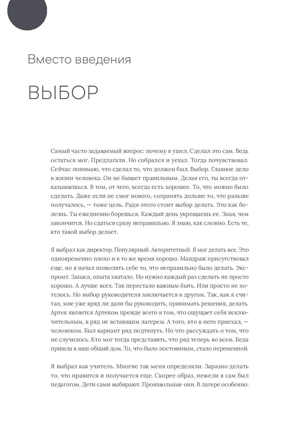 Эта книга – не просто история о легендарном лагере, Международном детском центре "Артек". Это глубокие, откровенные размышления его бывшего руководителя о борьбе за трансформацию устаревшей системы, о преодолении инерции и бюрократии, о создании уникального пространства, где главными ценностями стали свобода, доверие и искренность.
