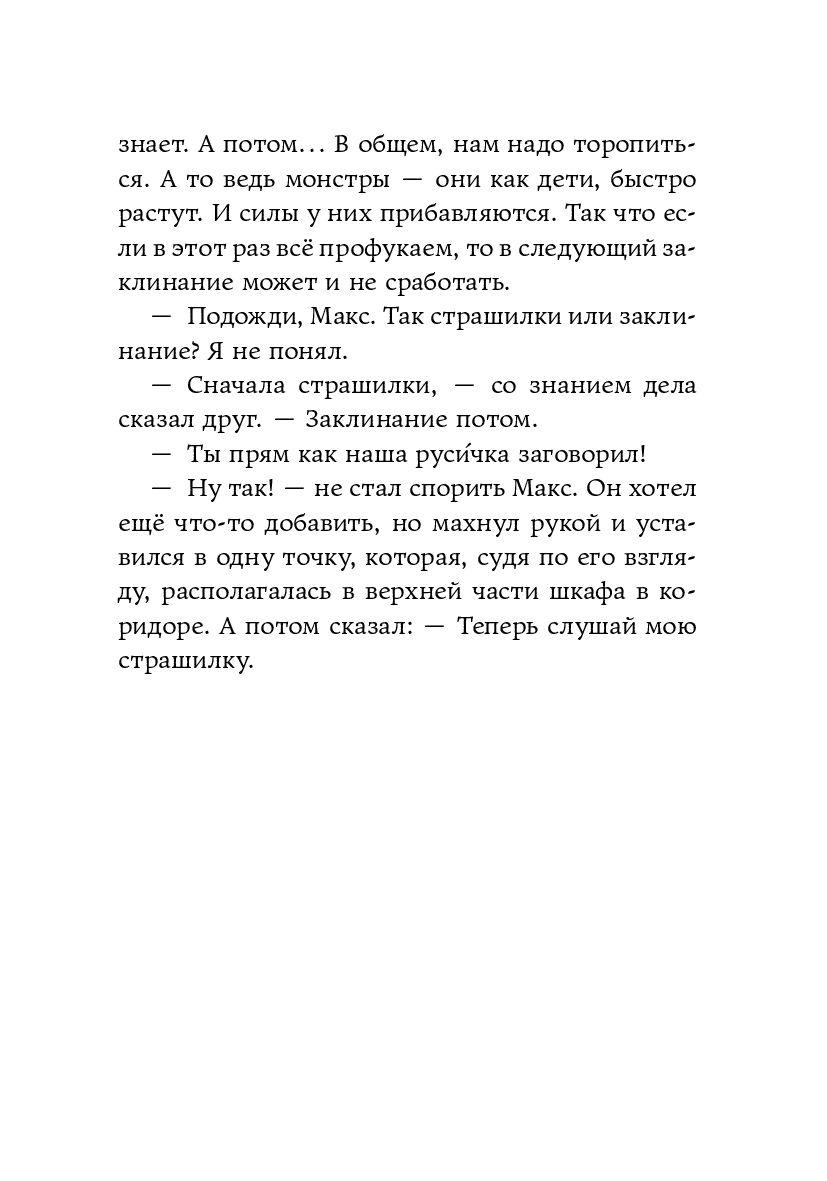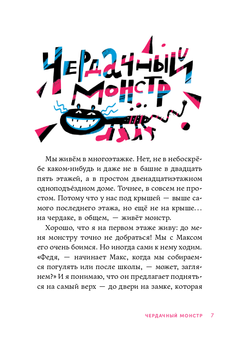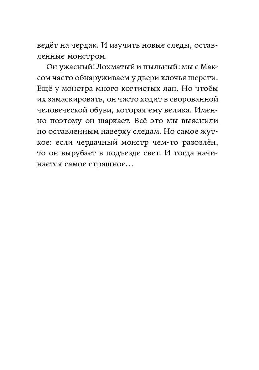 Федя и Макс знают, как победить страх и что делать, если на чердаке твоего дома поселился монстр! Конечно, его никто не видел, но все знают, что именно он выключает свет и ломает лифт. Но Федя и Макс не боятся – они решают бороться с чудовищем с помощью... страшилок! Одна страшнее другой: механическая точилка, голодный унитаз, пластилиновая кукла вуду... Смогут ли эти весёлые истории прогнать монстра с чердака? И какой страшный секрет прячется в самом конце этой приключенческой истории?