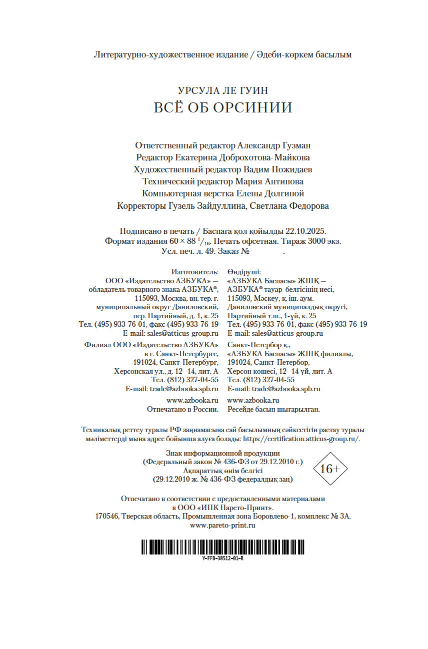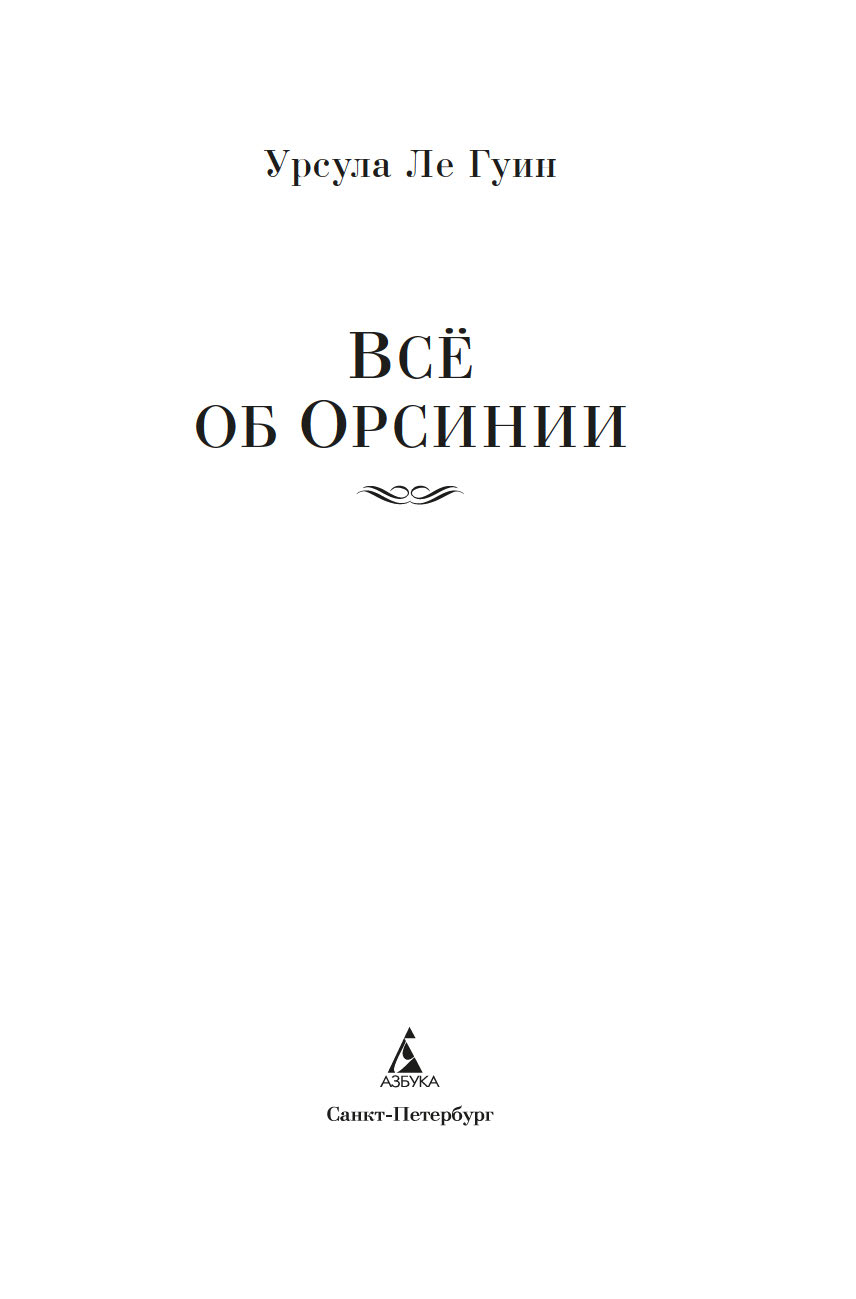 Книга "Всё об Орсинии", составленная Ле Гуин незадолго до смерти, включает роман "Малафрена", сборник "Рассказы об Орсинии" и ряд дополнительных материалов – народные песни провинции Монтайна, поздние рассказы, подробное предисловие. Часть текстов публикуется по-русски впервые или в новых переводах, остальные – в новой редакции.