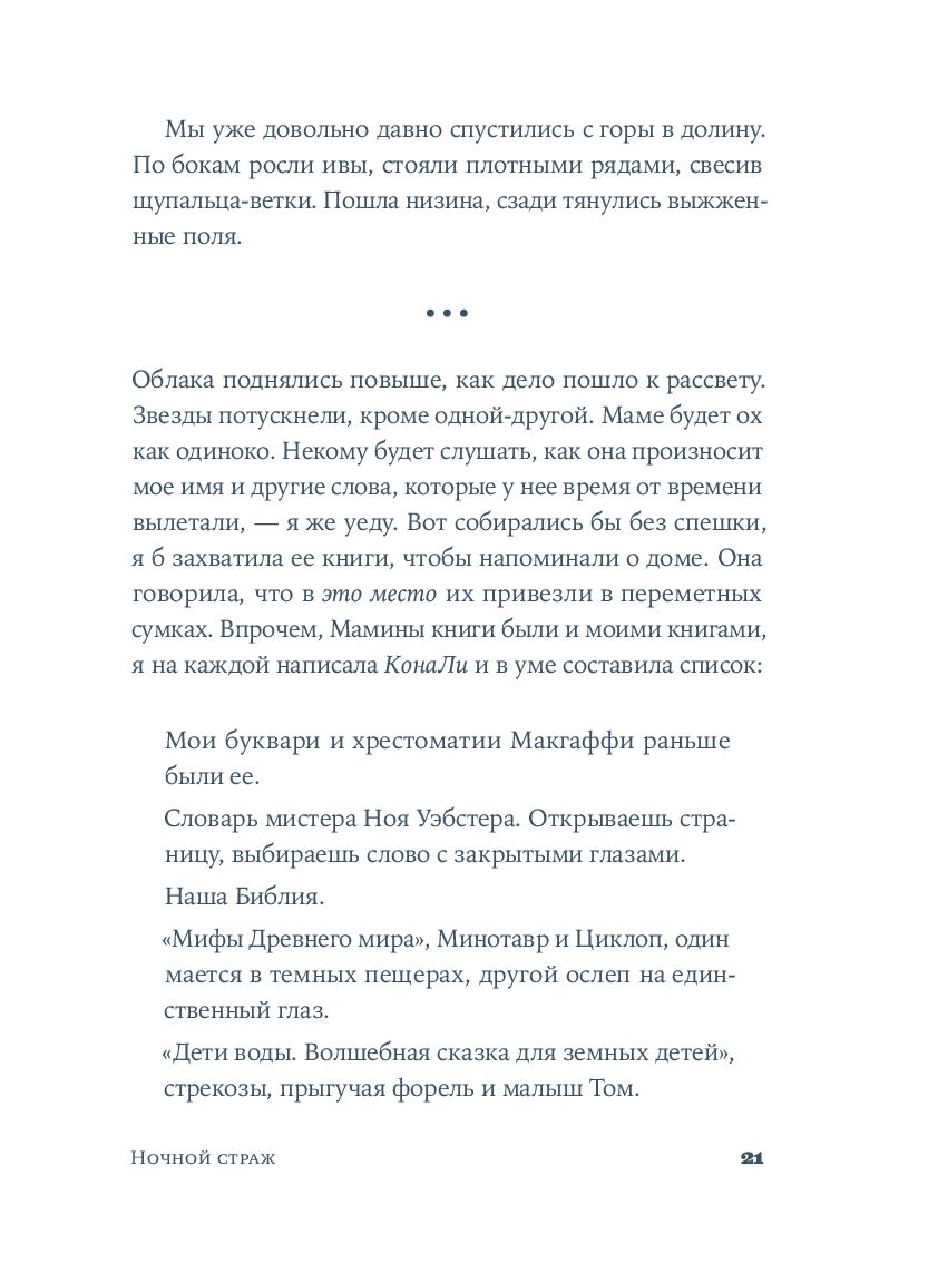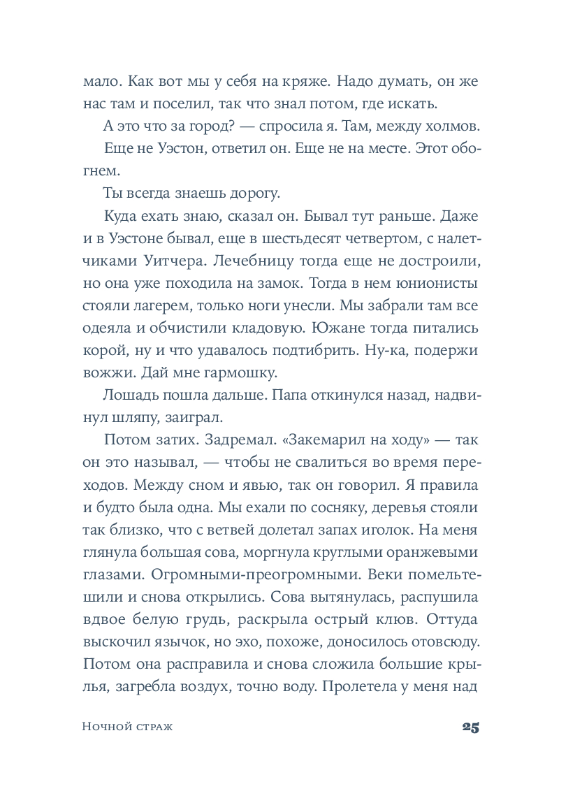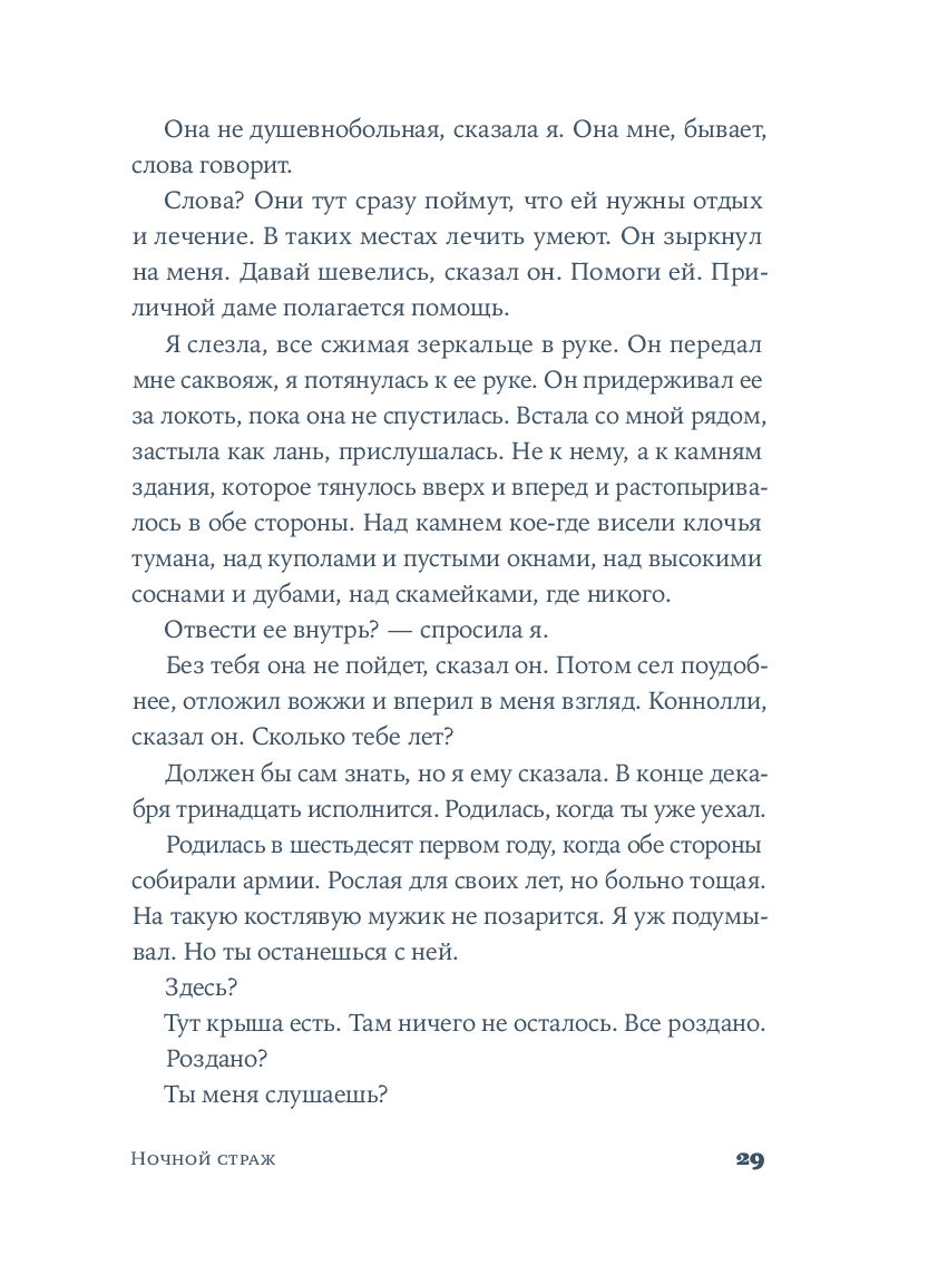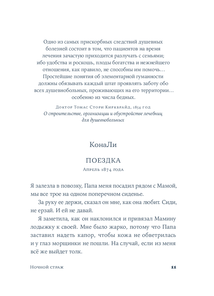 Америка, 1874 год. На дорогах еще недавно охваченной Гражданской войной страны пересекаются судьбы мирных жителей и солдат, бродяг и беглецов. Двенадцатилетняя КонаЛи вынуждена отправиться в путь с матерью, которая не разговаривает уже больше года. Выдавая себя за леди и служанку, они находят убежище в лечебнице для душевнобольных. Покой обитателей в этих стенах оберегает израненный, потерявший память солдат – Ночной Страж.
