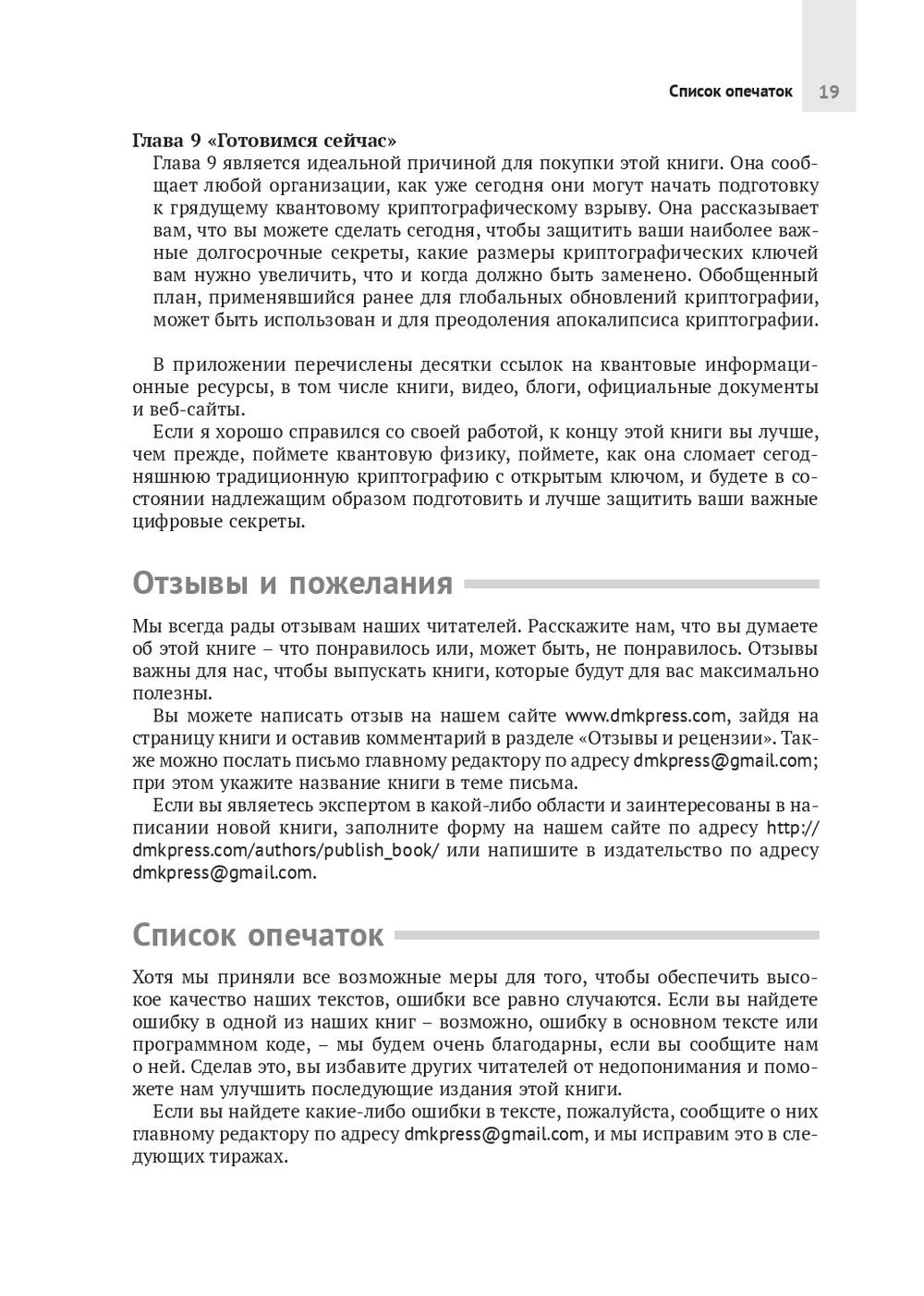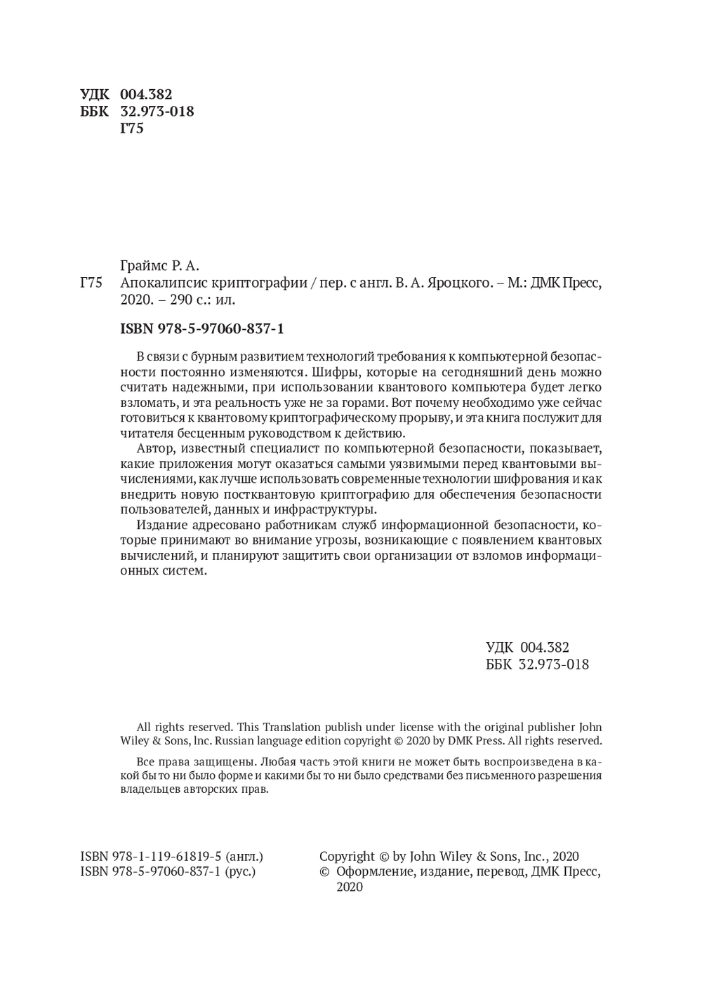 В связи с бурным развитием технологий требования к компьютерной безопасности постоянно изменяются. Шифры, которые на сегодняшний день можно считать надежными, при использовании квантового компьютера будет легко взломать, и эта реальность уже не за горами. Вот почему необходимо уже сейчас готовиться к квантовому криптографическому прорыву, и эта книга послужит для читателя бесценным руководством к действию.