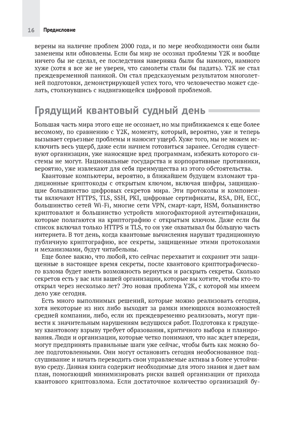 Автор, известный специалист по компьютерной безопасности, показывает, какие приложения могут оказаться самыми уязвимыми перед квантовыми вычислениями, как лучше использовать современные технологии шифрования и как внедрить новую постквантовую криптографию для обеспечения безопасности пользователей, данных и инфраструктуры.