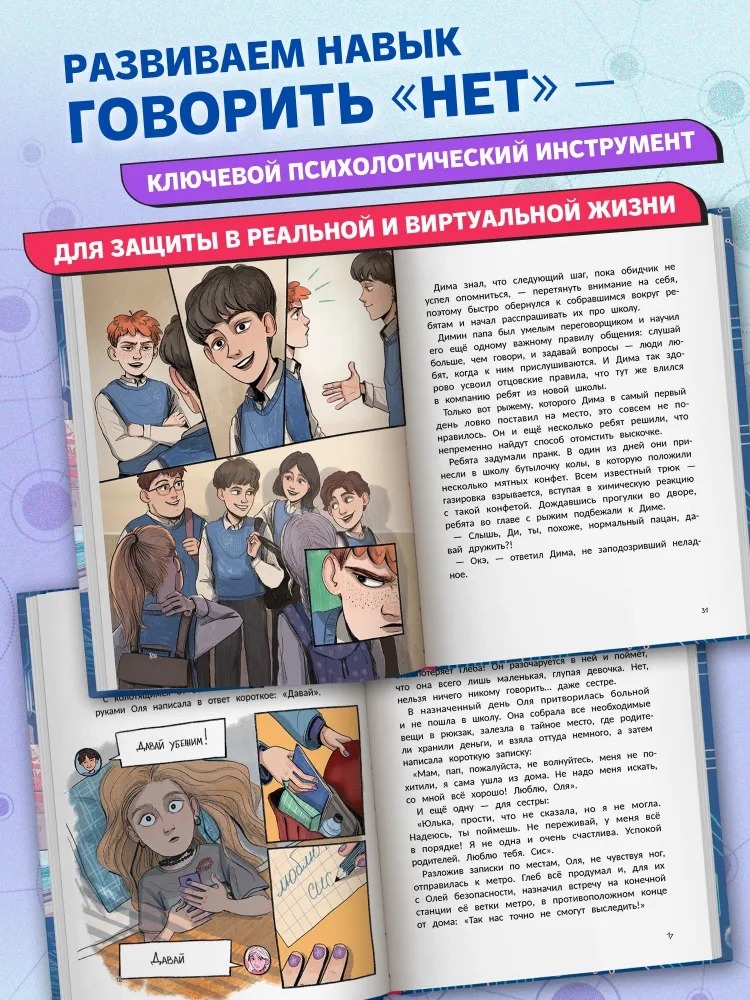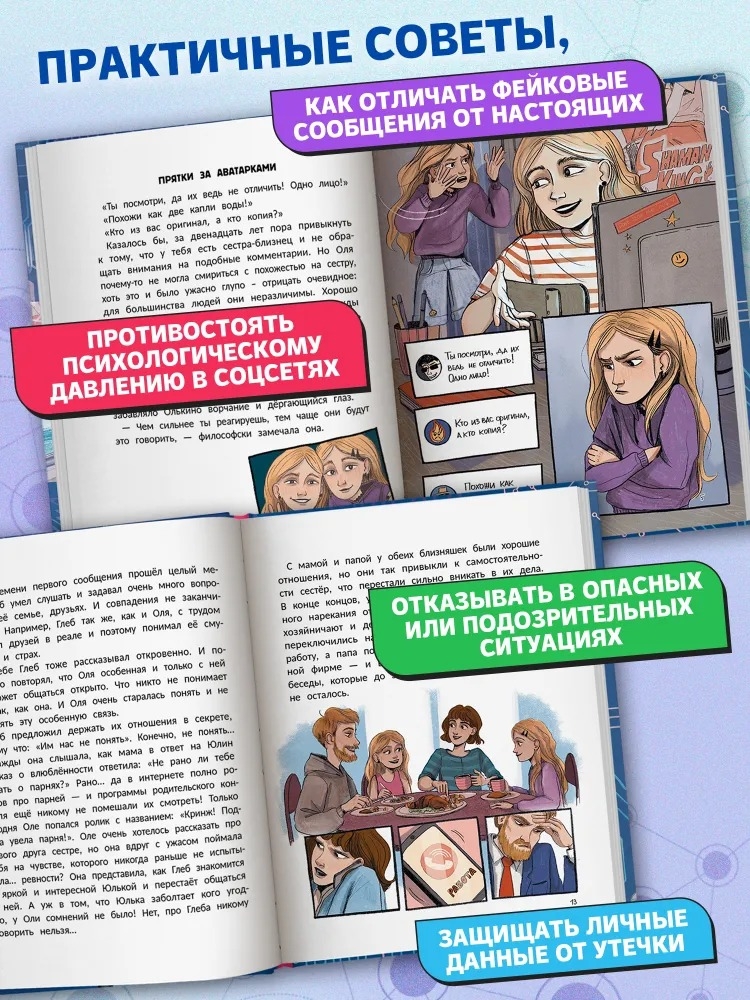 На красочных примерах Женя Асеева – психолог и сказкотерапевт – даёт практичные советы, как отличать фейковые сообщения от настоящих, противостоять психологическому давлению в соцсетях, защищать личные данные от утечки, отказывать в опасных или подозрительных ситуациях.