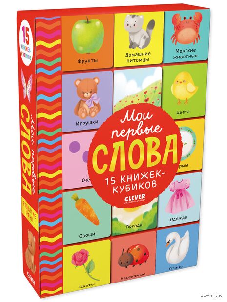 В каждой из 15 маленьких книжечек собраны первые слова для крохи, 15 познавательных тем: фрукты, овощи, игрушки, одежда, животные, природа и многое другое. Он будет сам листать картонные странички книги для детей и легко держать в руках книжку, разглядывая рисунки. Подрастая, ребенок сможет использовать книжки-кубики как погремушки или строить башенки. И конечно, развивать внимание и логическое мышление, память и мелкую моторику, раскладывая кубики по нужным ячейкам в коробке-сортере.