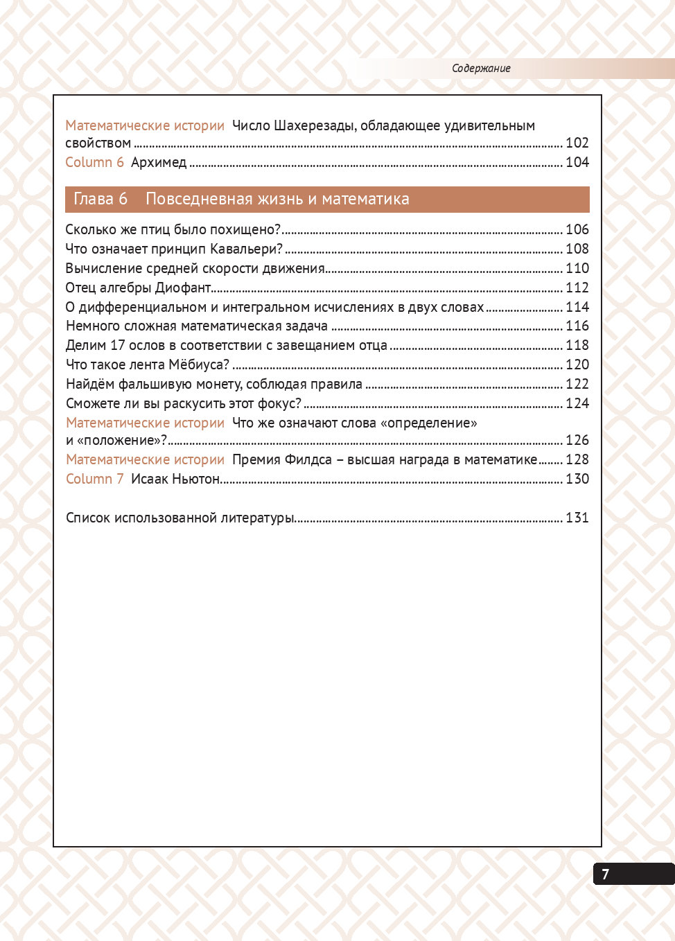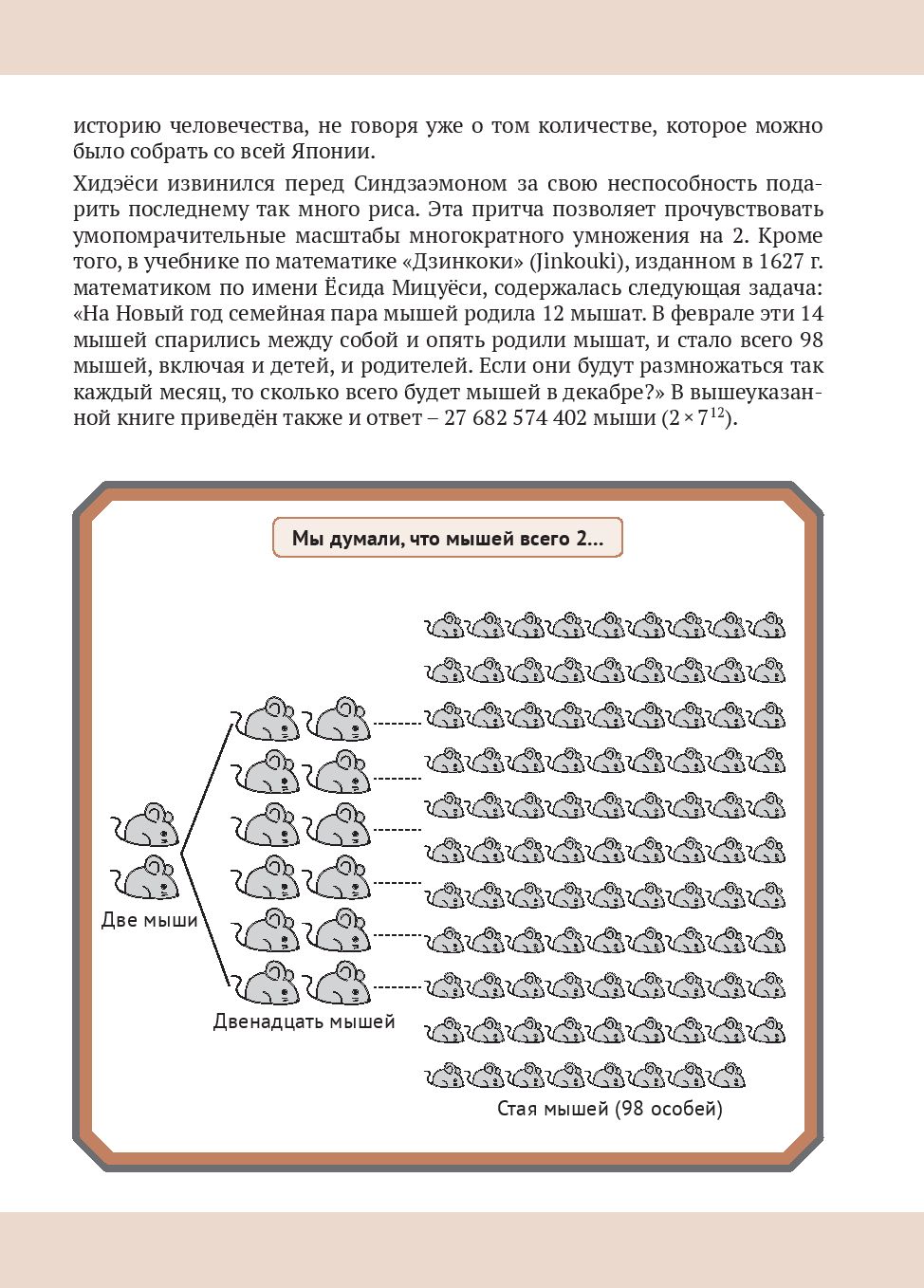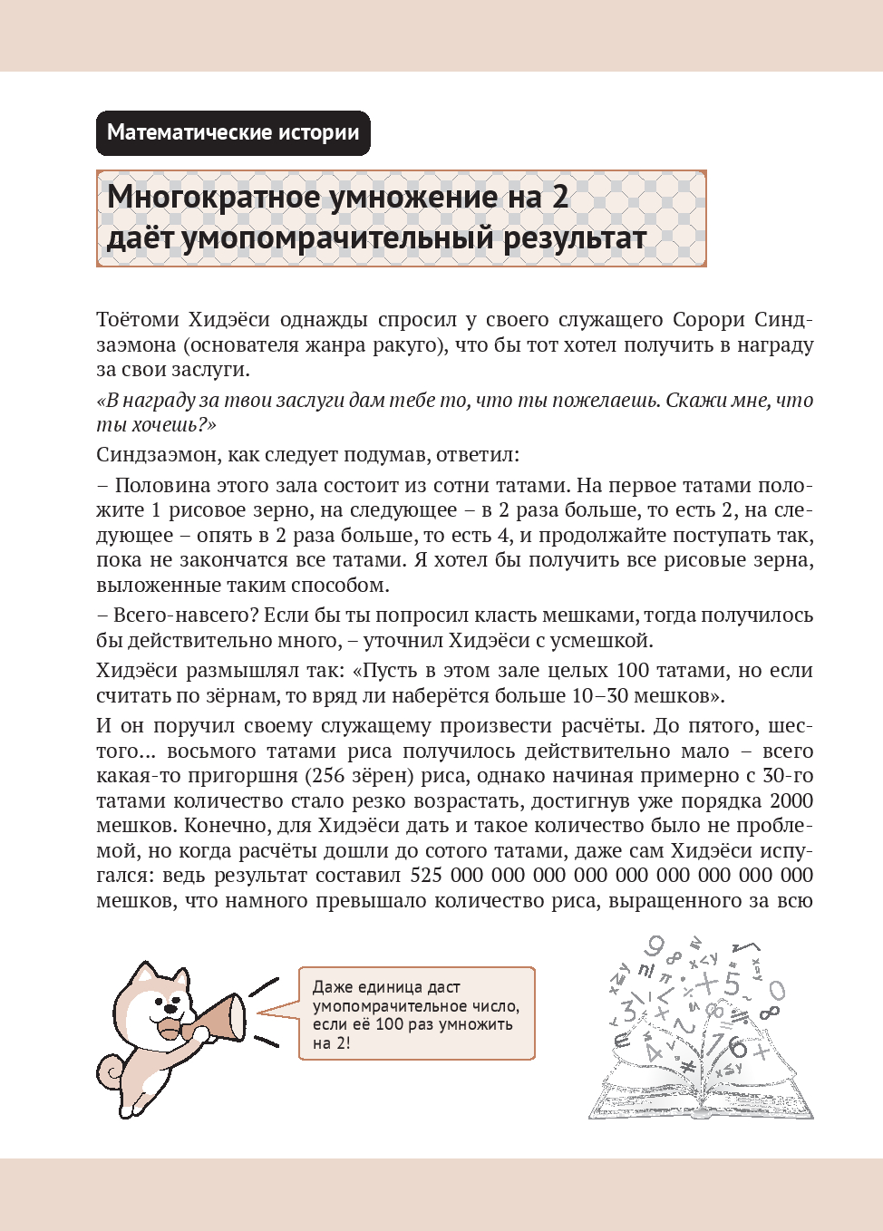 Помимо разбора увлекательных задач читатель найдёт в книге любопытные истории – о появлении математических символов, о "числе Шахерезады", о том, к каким неожиданным результатам приводит многократное умножение на 2, и о многом другом. В конце каждой главы приводятся краткие рассказы об известных математиках прошлого.