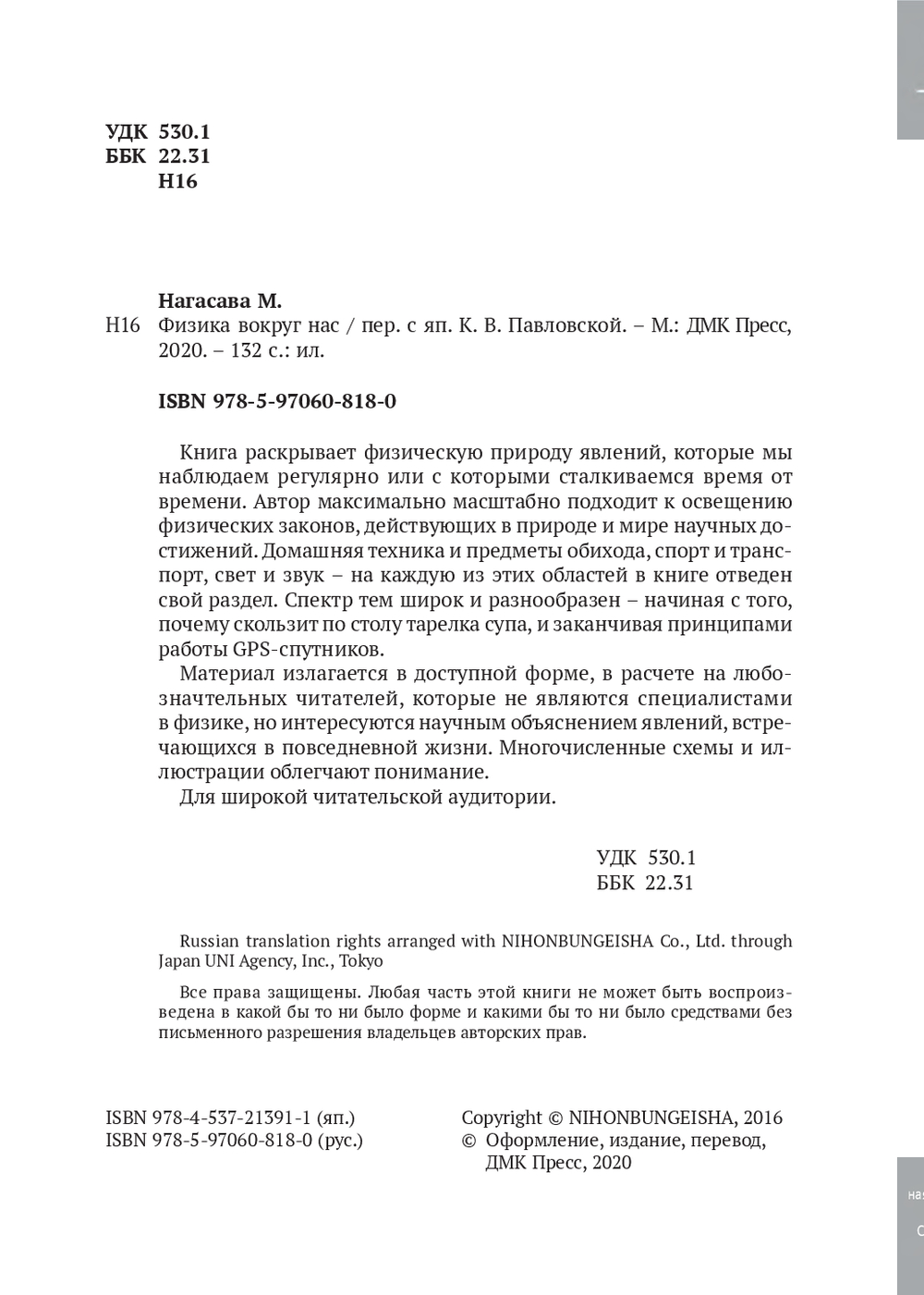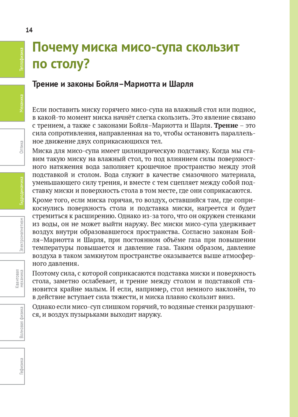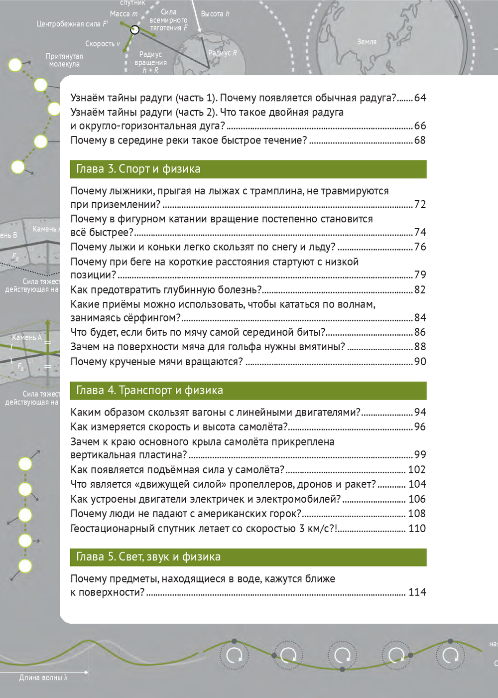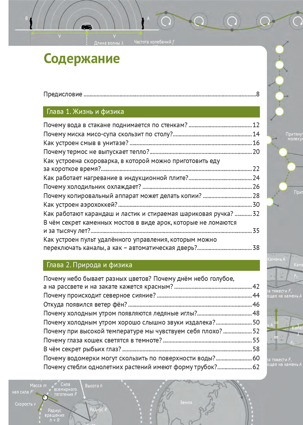 Книга раскрывает физическую природу явлений, которые мы наблюдаем регулярно или с которыми сталкиваемся время от времени. Автор максимально масштабно подходит к освещению физических законов, действующих в природе и в мире научных достижений. Домашняя техника и предметы обихода, спорт и транспорт, свет и звук – на каждую из этих областей в книге отведён свой раздел. Спектр тем широк и разнообразен – начиная с того, почему скользит по столу тарелка супа, и заканчивая принципами работы GPS-спутников.