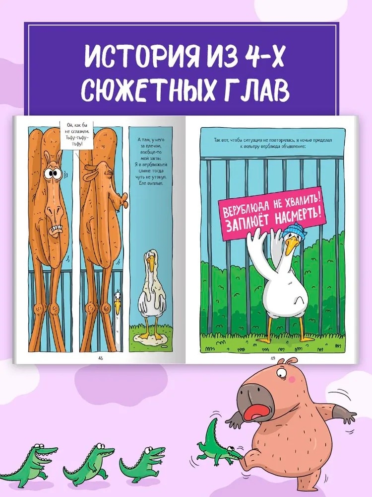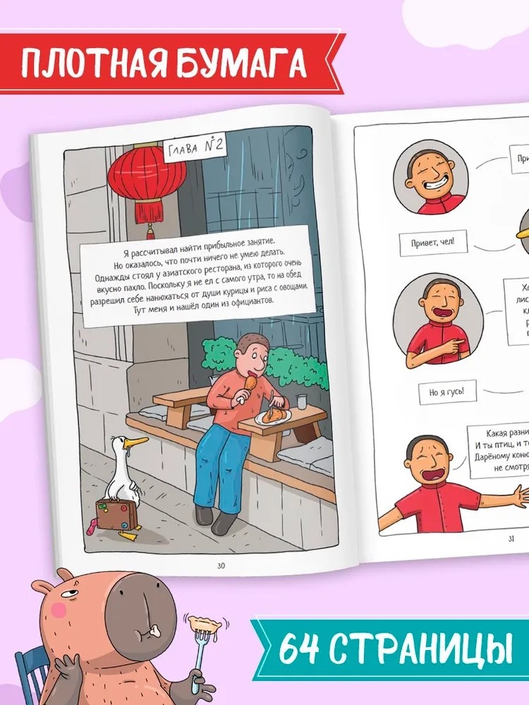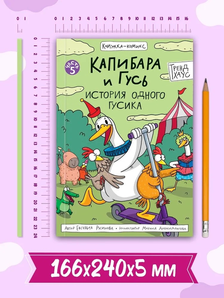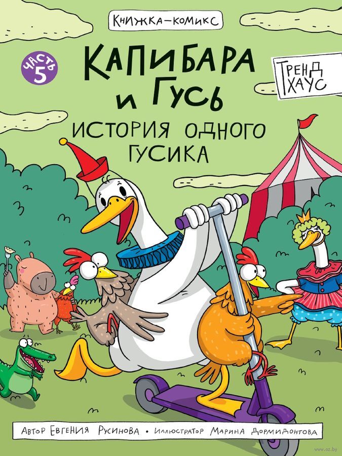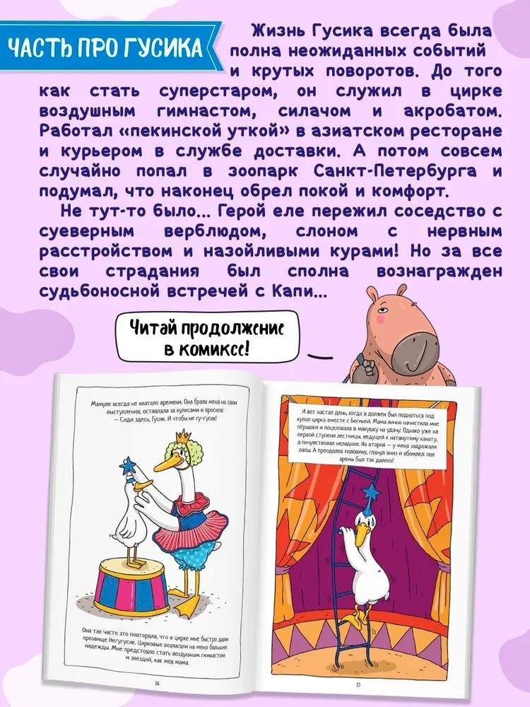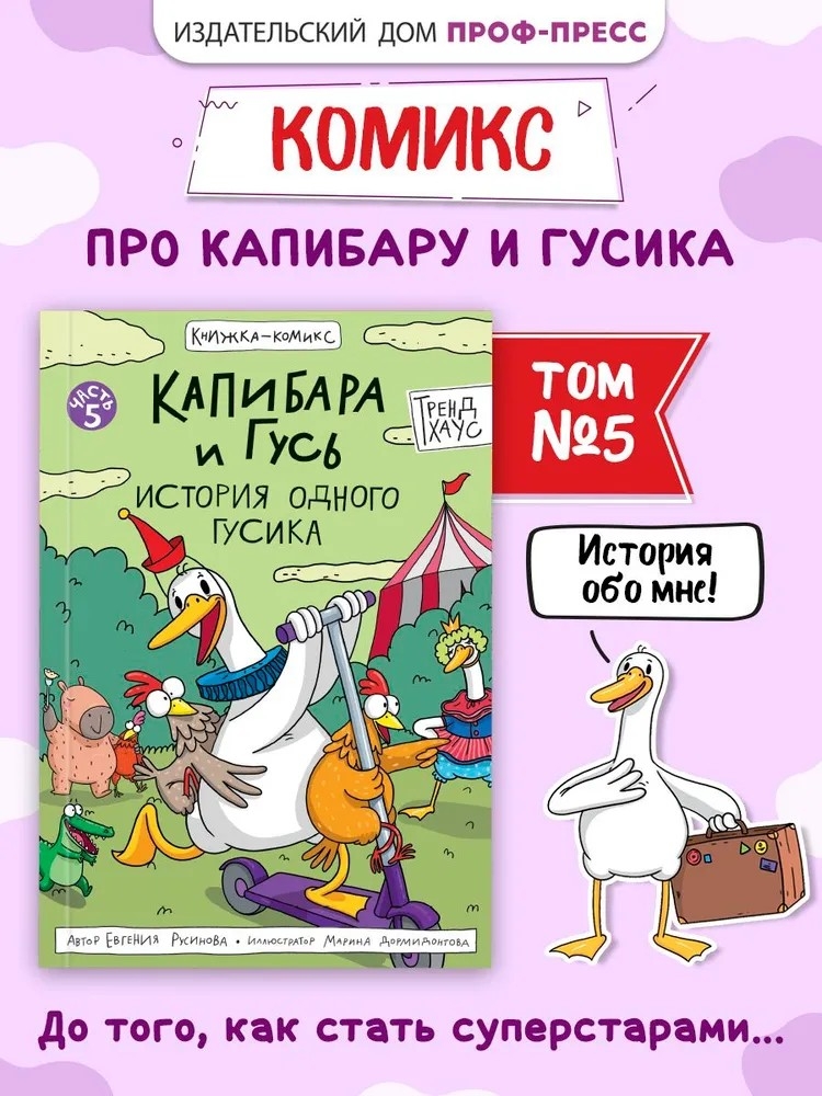 Комикс "Капибара и Гусь" от издательства "ПРОФ-ПРЕСС" расскажут вам о том, что было до популярности Гусика в интернете. 5 том "Тренд Хауса" начинает свой путь с мамы Гуся, гусыни по имени Богиня, которая когда-то сверкала на манеже цирка шапито как настоящая звезда. Её завораживающее выступление привлекало множество зрителей, и именно поэтому на Негугусика легли огромные надежды всех цирковых работников. Они считали его избранным, способным продолжить великое дело Богини.
