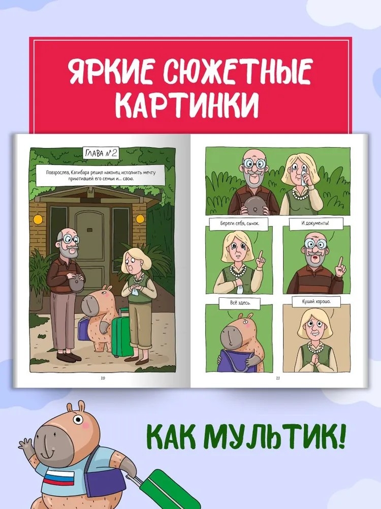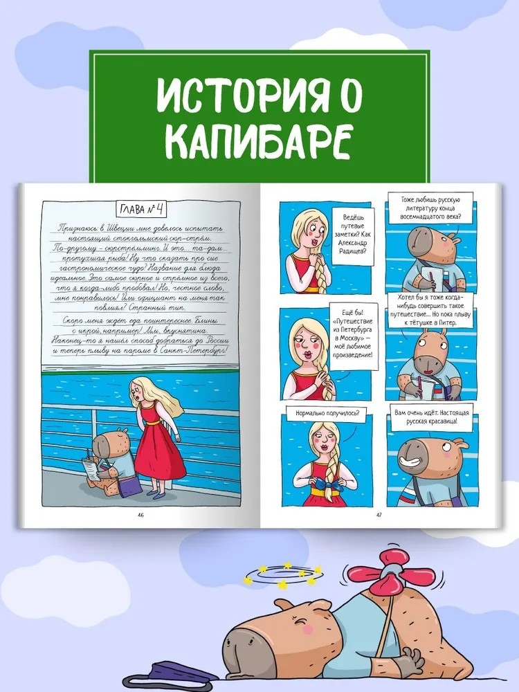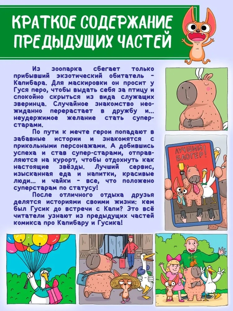 Поезд мчится в Москву, а мы продолжаем знакомиться с удивительными историями наших героев! 7 том книжки "Капибара и Гусь. Капибарам на Руси жить хорошо" рассказывает о том, как Капи попал в Ленинградский зоопарк.