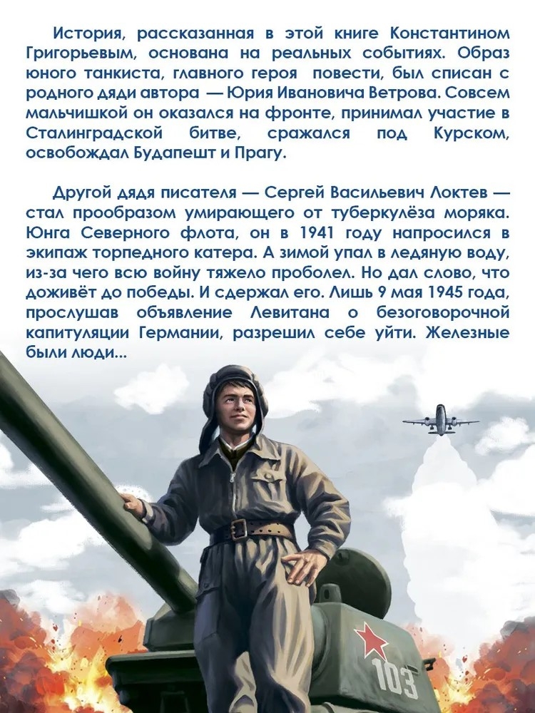 История, рассказанная в этой книге Константином Григорьевым, основана на реальных событиях. Образ юного танкиста, главного героя повести, был списан с родного дяди автора – Юрия Ивановича Ветрова. Совсем мальчишкой он оказался на фронте, принимал участие в Сталинградской битве, сражался под Курском, освобождал Будапешт и Прагу. Другой дядя писателя – Сергей Васильевич Локтев – стал прообразом умирающего от туберкулёза моряка. Юнга Северного флота, он в 1941 году напросился в экипаж торпедного катера. А зимой упал в ледяную воду, из-за чего всю войну тяжело проболел. Но дал слово, что доживёт до победы. И сдержал его. Лишь 9 мая 1945 года, прослушав объявление Левитана о безоговорочной капитуляции Германии, разрешил себе уйти.