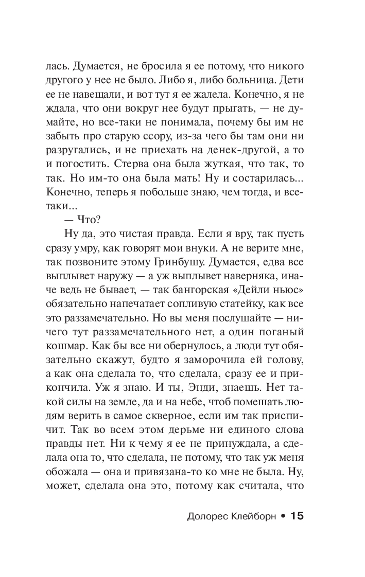 Все в городе уверены, что к смерти причастна ее экономка Долорес Клейборн, ведь она уже обвинялась в убийстве мужа двадцать лет назад. Однако тогда ее вина не была доказана…