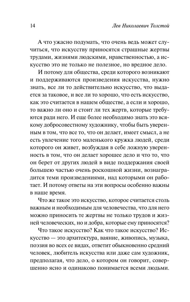 "Что такое искусство?" – это главное философско-эстетическое исследование писателя. Толстой считает, что настоящее искусство там, где автор передает искренние чувства людям, и это объединяет людей и делает их духовно ближе. Что искусство должно способствовать нравственному улучшению людей и укреплению общих чувств и ценностей, создавать искреннюю эмоциональную связь, которая будет вести людей к добру.