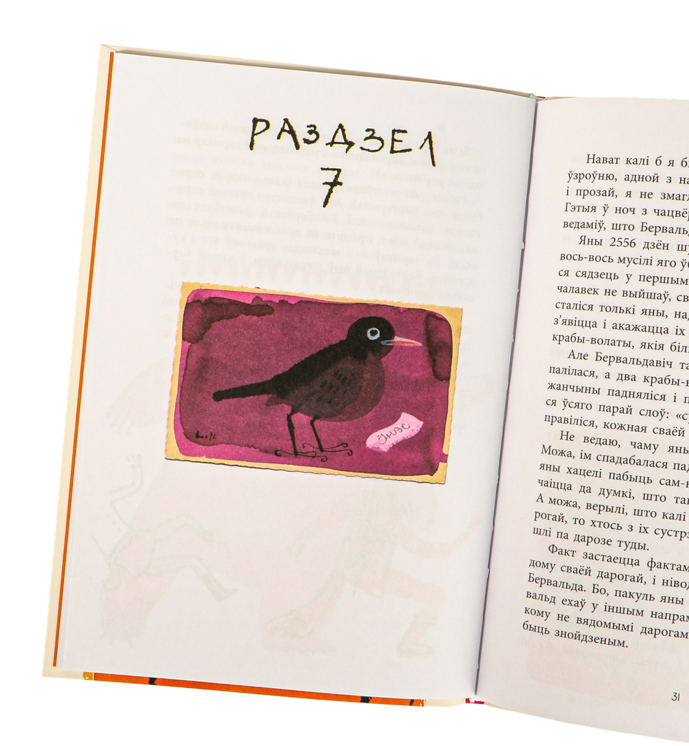Гэта краб-волат з вострава Кадзьяк. Ён велізарны і можа важыць ажно пятнаццаць кілаграмаў. Ці мае гэта значэнне для гісторыі? Даведаецеся, калі прачытаеце кнігу. Але ў гэтай гісторыі так шмат персанажаў, істот, мясцін – некаторыя з іх важныя, а некаторыя не вельмі, – што мне цяжка было выбраць, хто ж ці што ж будзе ўпрыгожваць адваротны бок вокладкі. Таму я скарысталася самым надзейным і найбольш навуковым спосабам: узяла ілюстрацыі з кнігі, паклала кожную ў яркі канверт і пакінула на сонцы на тры дні, каб паглядзець, які з канвертаў мацней за ўсё выгарыць. Гатова! Так і было вырашана, які малюнак будзе на адваротным баку вокладкі.