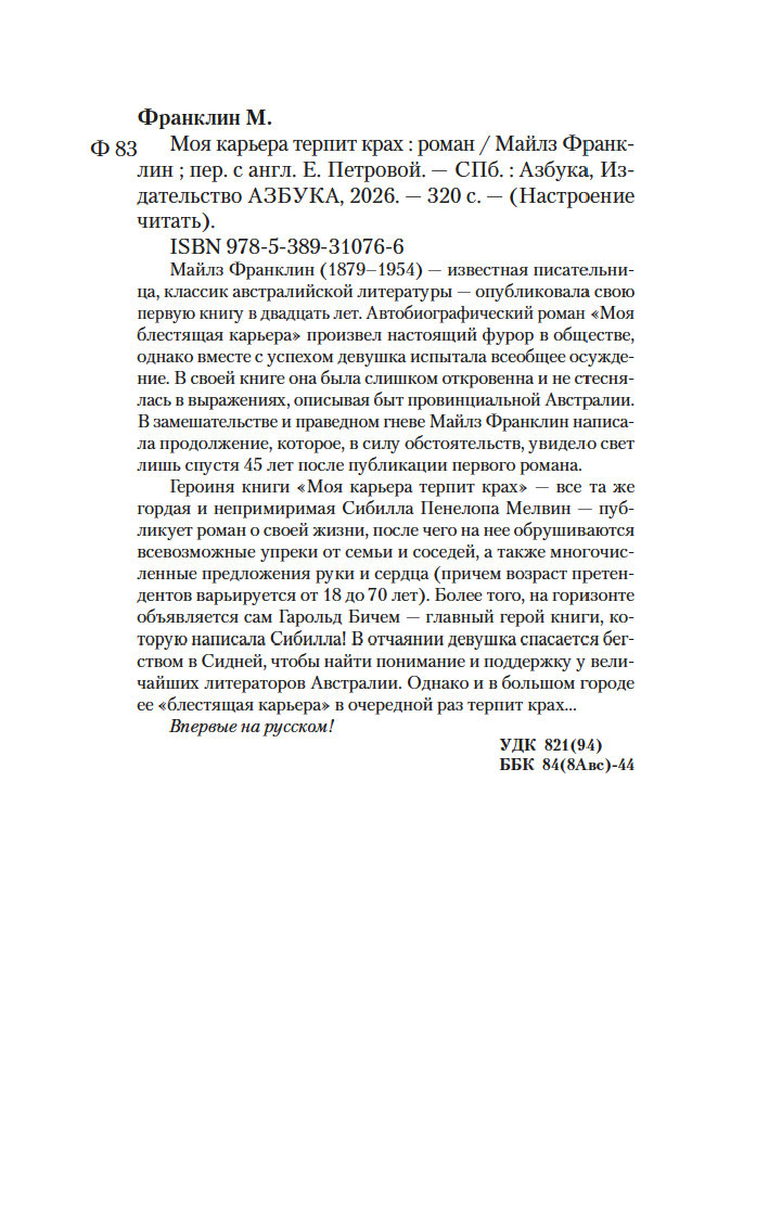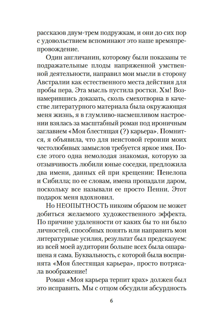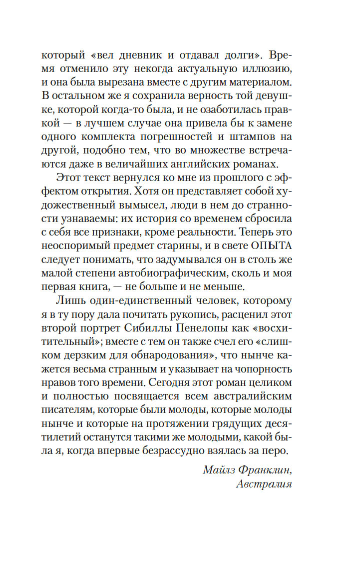 Майлз Франклин (1879-1954) – известная писательница, классик австралийской литературы – опубликовала свою первую книгу в двадцать лет. Автобиографический роман "Моя блестящая карьера" произвел настоящий фурор в обществе, однако вместе с успехом девушка испытала всеобщее осуждение. В своей книге она была слишком откровенна и не стеснялась в выражениях, описывая быт провинциальной Австралии. В замешательстве и праведном гневе Майлз Франклин написала продолжение, которое, в силу обстоятельств, увидело свет лишь спустя 45 лет после публикации первого романа.