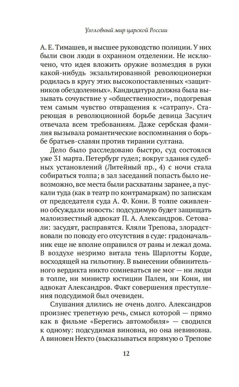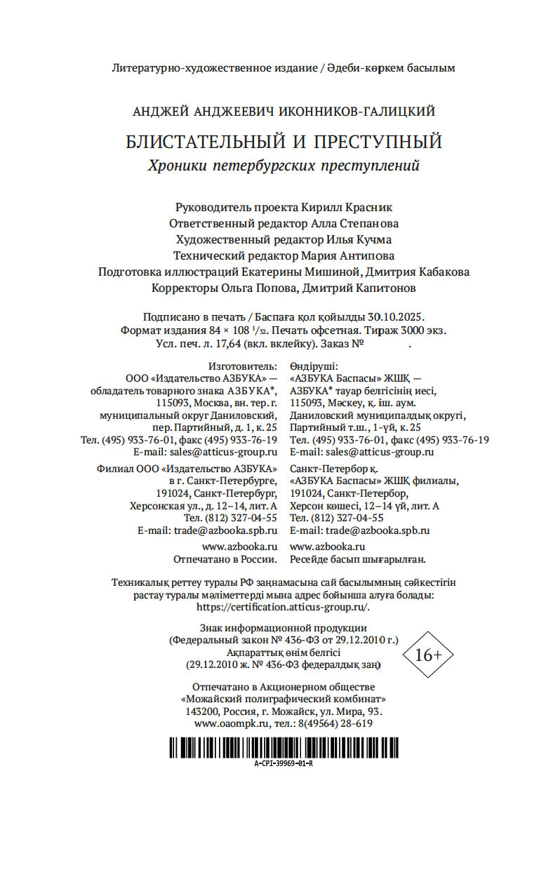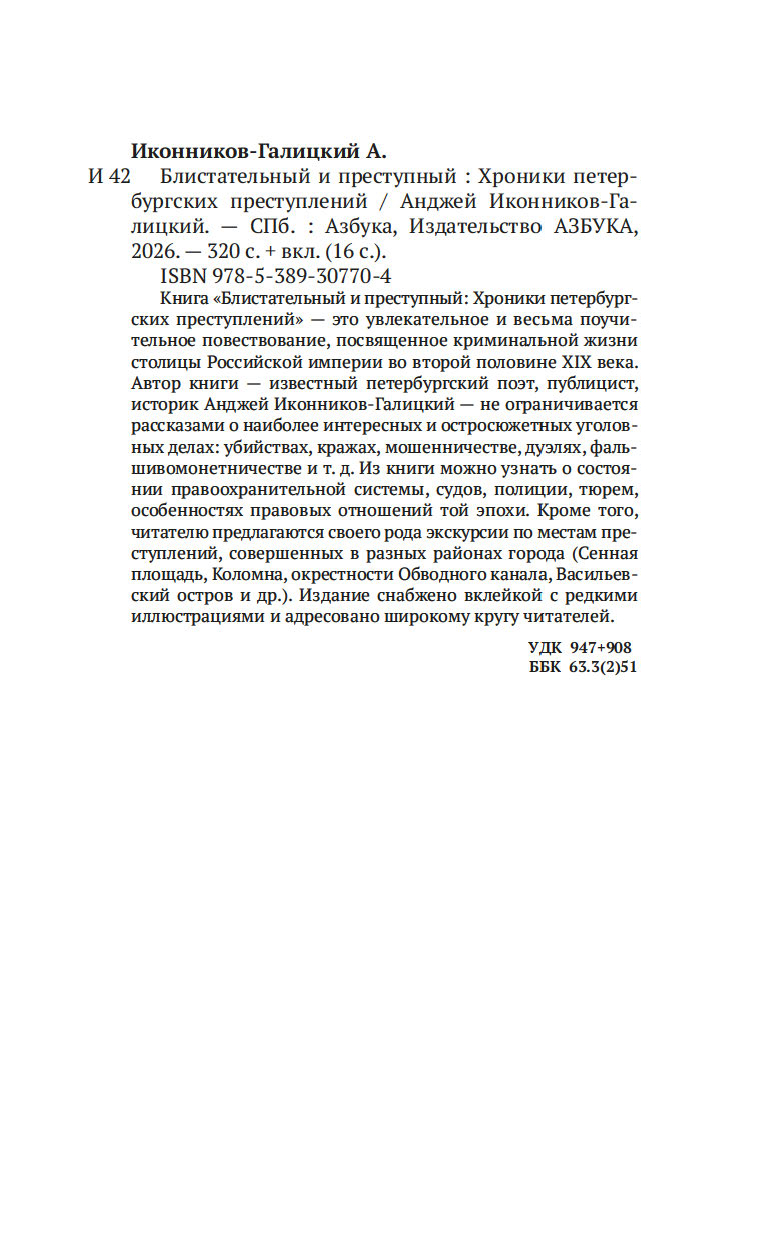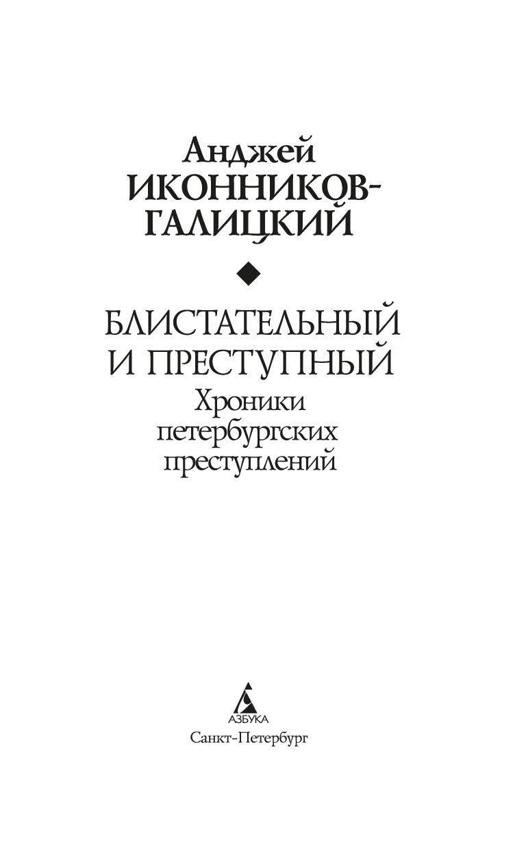 Книга "Блистательный и преступный: Хроники петербургских преступлений" – это увлекательное и весьма поучительное повествование, посвященное криминальной жизни столицы Российской империи во второй половине XIX века. Автор книги – известный петербургский поэт, публицист, историк Анджей Иконников-Галицкий – не ограничивается рассказами о наиболее интересных и остросюжетных уголовных делах: убийствах, кражах, мошенничестве, дуэлях, фальшивомонетничестве и т. д. Из книги можно узнать о состоянии правоохранительной системы, судов, полиции, тюрем, особенностях правовых отношений той эпохи. Кроме того, читателю предлагаются своего рода экскурсии по местам преступлений, совершенных в разных районах города (Сенная площадь, Коломна, окрестности Обводного канала, Васильевский остров и др.).