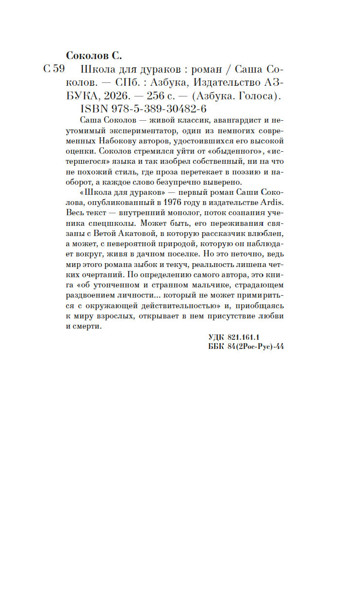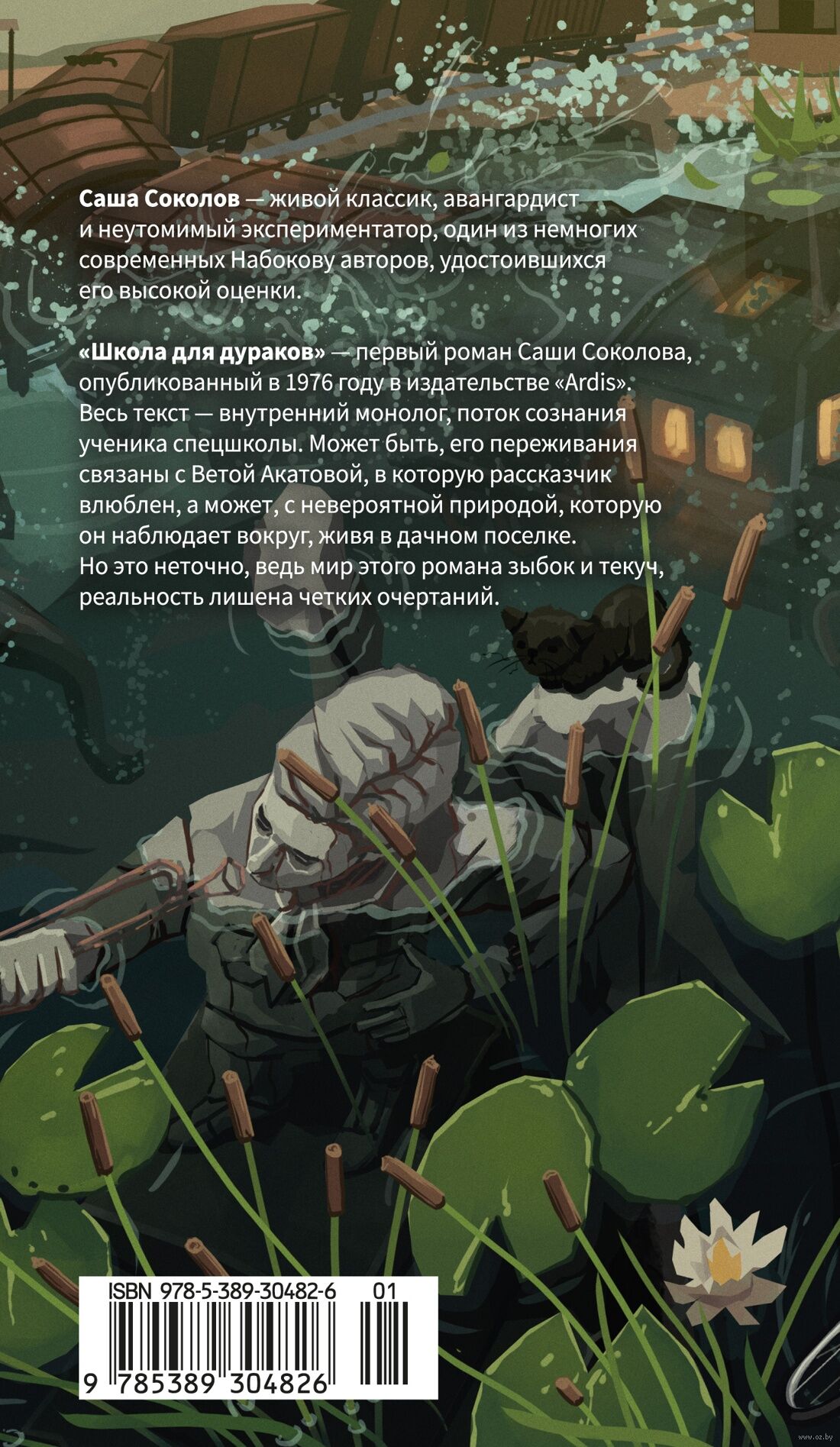 "Школа для дураков" – первый роман Саши Соколова, опубликованный в 1976 году в издательстве Ardis. Весь текст – внутренний монолог, поток сознания ученика спецшколы. Может быть, его переживания связаны с Ветой Акатовой, в которую рассказчик влюблен, а может, с невероятной природой, которую он наблюдает вокруг, живя в дачном поселке. Но это неточно, ведь мир этого романа зыбок и текуч, реальность лишена четких очертаний. По определению самого автора, это книга "об утонченном и странном мальчике, страдающем раздвоением личности… который не может примириться с окружающей действительностью" и, приобщаясь к миру взрослых, открывает в нем присутствие любви и смерти.