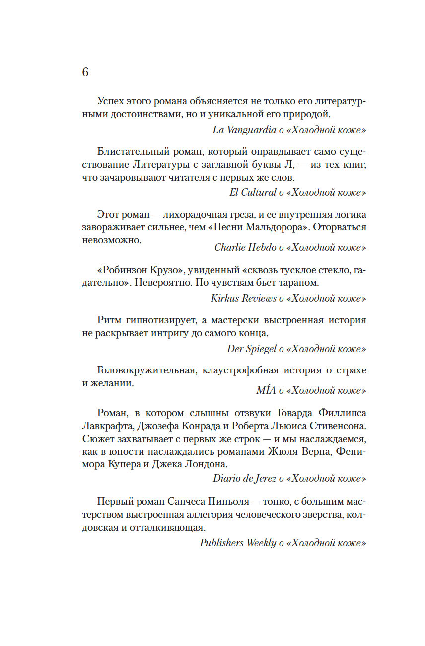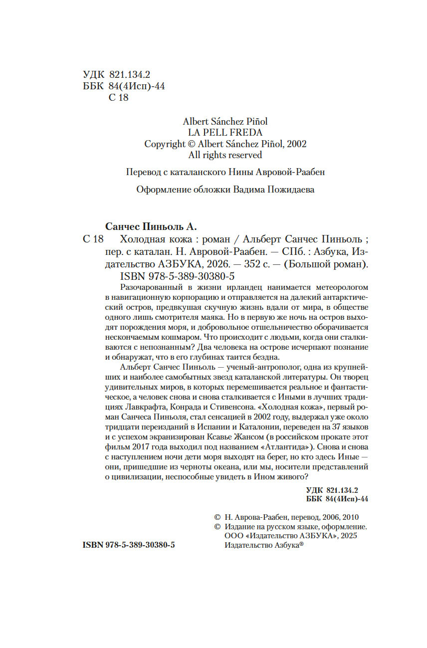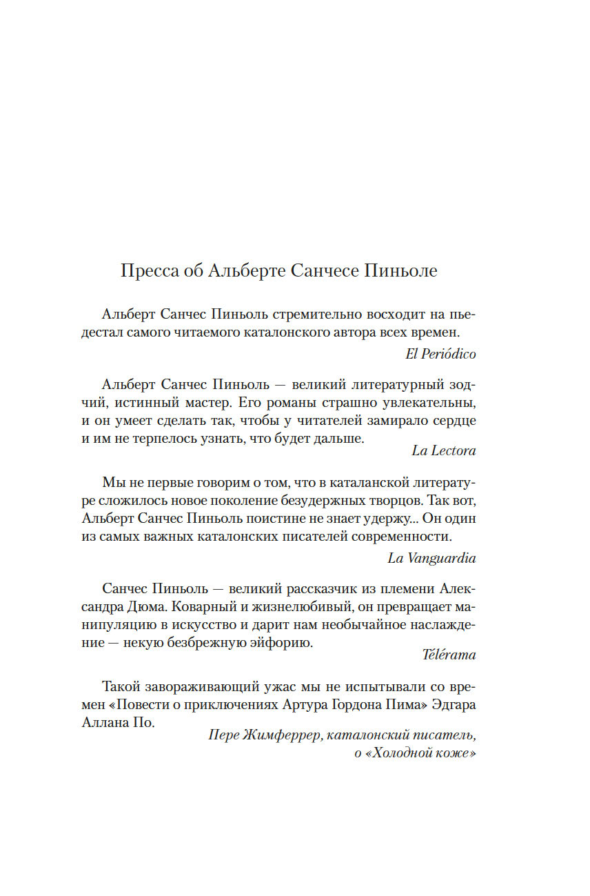 Альберт Санчес Пиньоль – ученый-антрополог, одна из крупнейших и наиболее самобытных звезд каталанской литературы. Он творец удивительных миров, в которых перемешивается реальное и фантастическое, а человек снова и снова сталкивается с Иными в лучших традициях Лавкрафта, Конрада и Стивенсона. "Холодная кожа", первый роман Санчеса Пиньоля, стал сенсацией в 2002 году, выдержал уже около тридцати переизданий в Испании и Каталонии, переведен на 37 языков и с успехом экранизирован Ксавье Жансом (в российском прокате этот фильм 2017 года выходил под названием "Атлантида"). Снова и снова с наступлением ночи дети моря выходят на берег, но кто здесь Иные – они, пришедшие из черноты океана, или мы, носители представлений о цивилизации, неспособные увидеть в Ином живого?