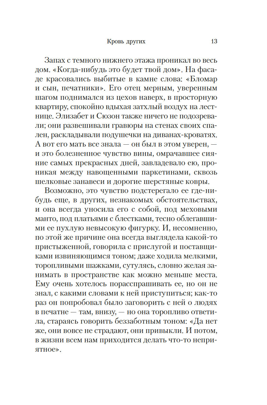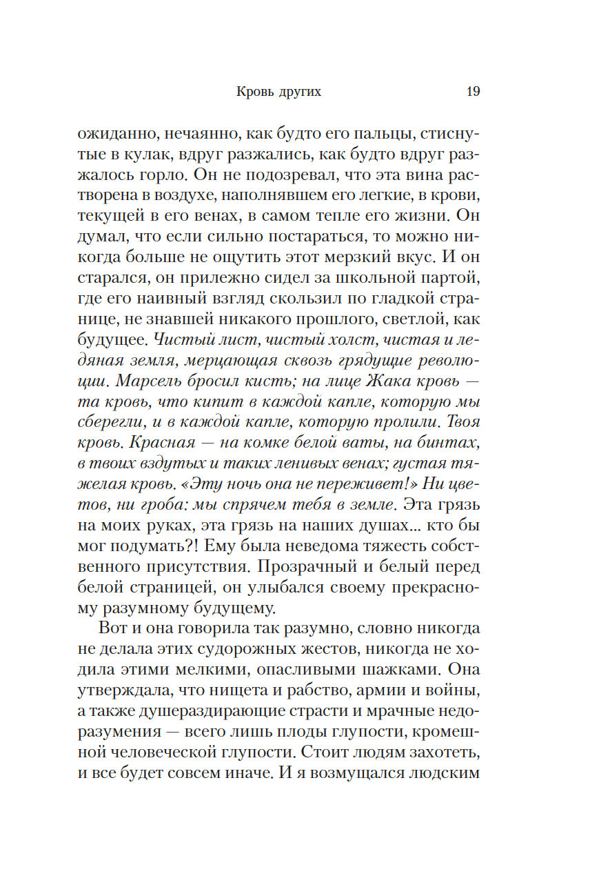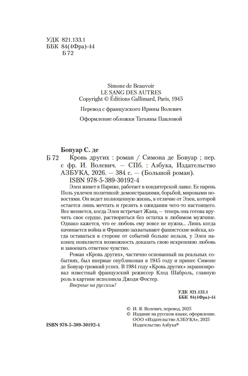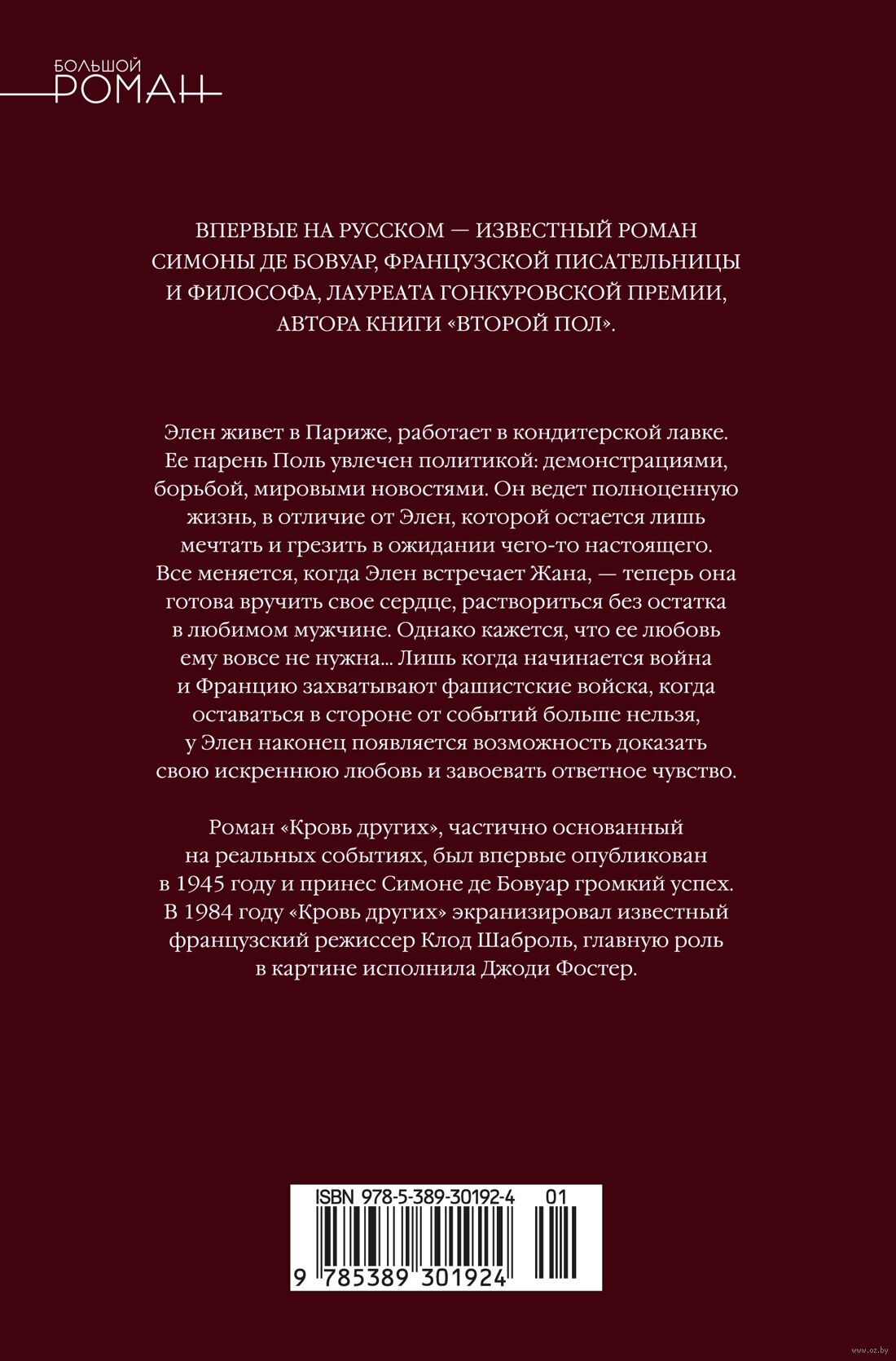 Роман "Кровь других", частично основанный на реальных событиях, был впервые опубликован в 1945 году и принес Симоне де Бовуар громкий успех. В 1984 году "Кровь других" экранизировал известный французский режиссер Клод Шаброль, главную роль в картине исполнила Джоди Фостер.