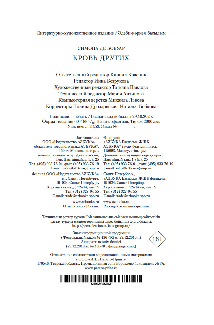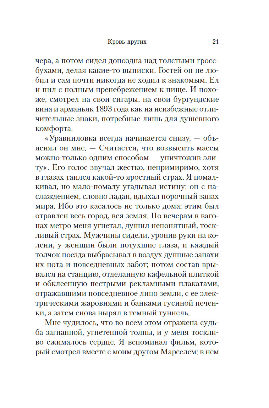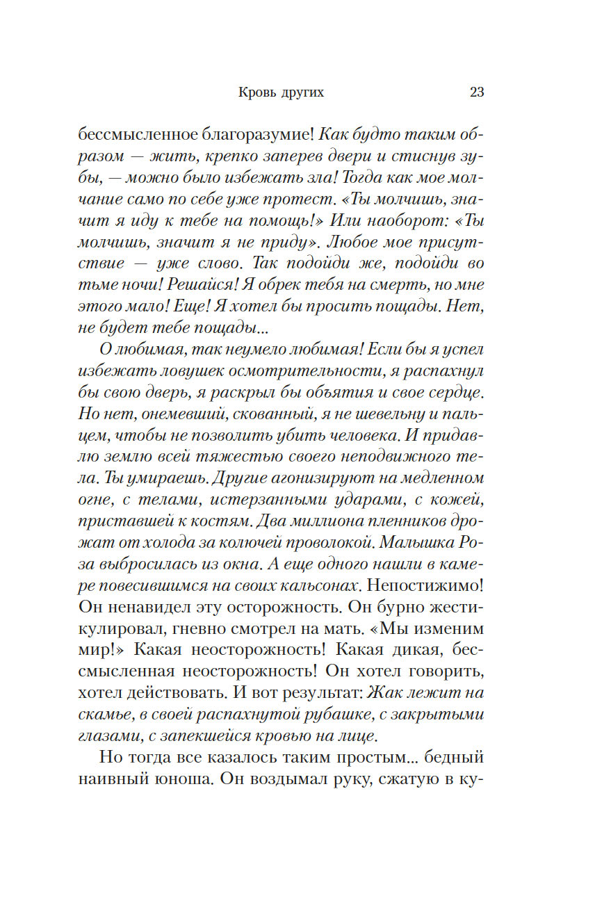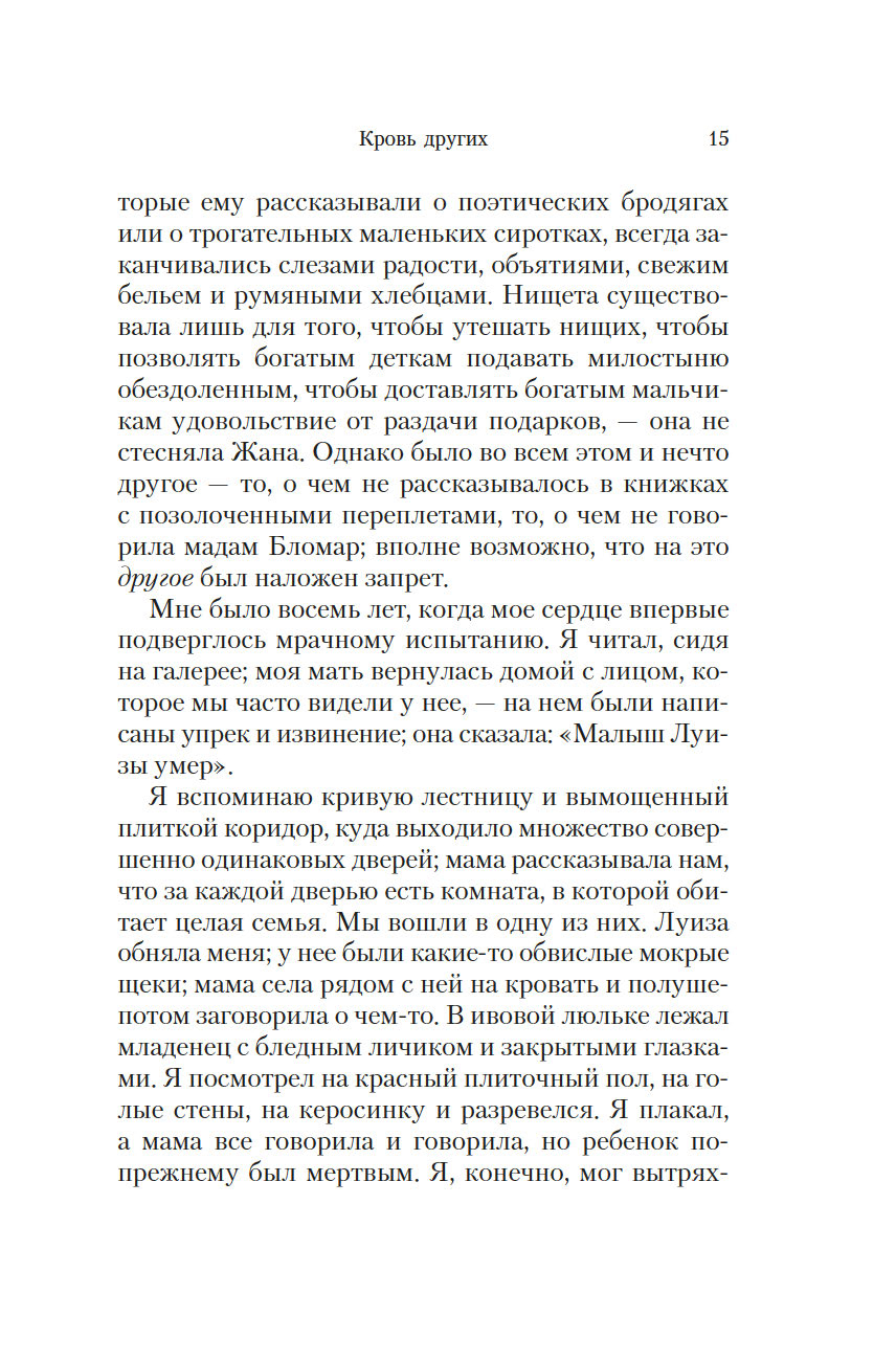 Роман "Кровь других", частично основанный на реальных событиях, был впервые опубликован в 1945 году и принес Симоне де Бовуар громкий успех. В 1984 году "Кровь других" экранизировал известный французский режиссер Клод Шаброль, главную роль в картине исполнила Джоди Фостер.