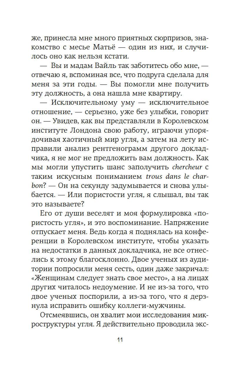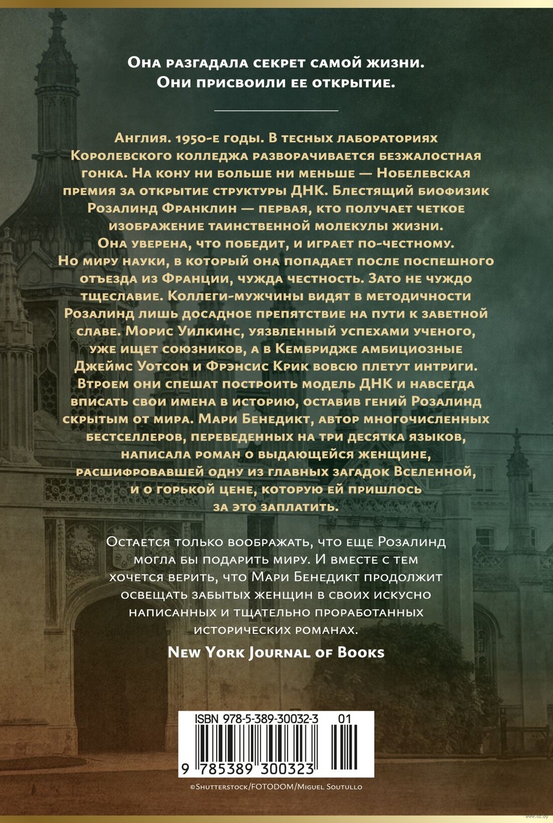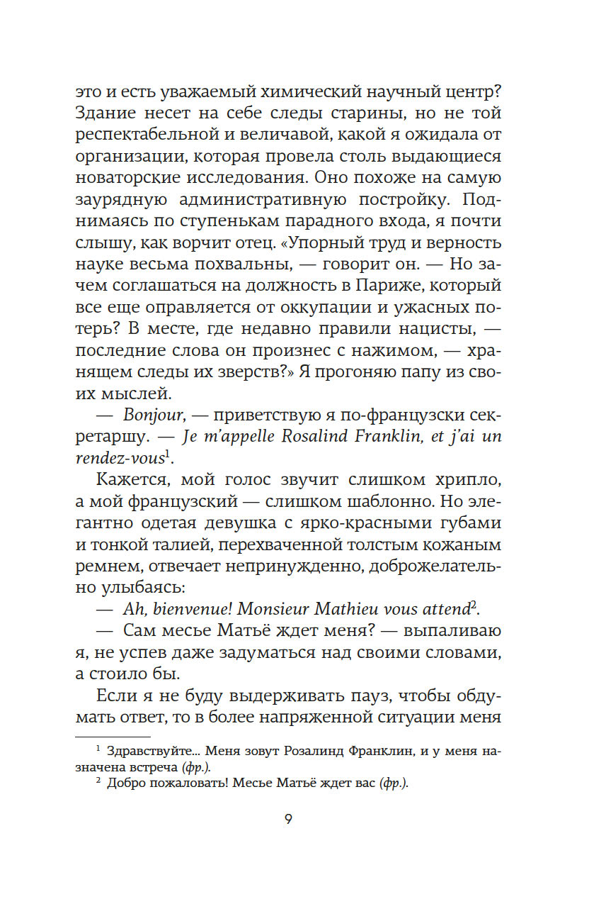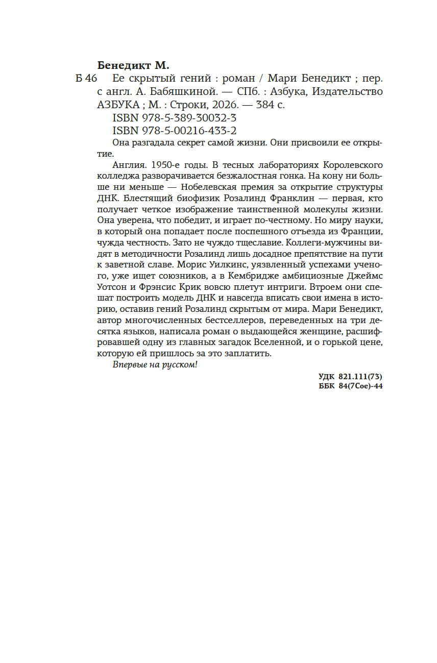 Англия. 1950-е годы. В тесных лабораториях Королевского колледжа разворачивается безжалостная гонка. На кону ни больше ни меньше – Нобелевская премия за открытие структуры ДНК. Блестящий биофизик Розалинд Франклин – первая, кто получает четкое изображение таинственной молекулы жизни. Она уверена, что победит, и играет по-честному. Но миру науки, в который она попадает после поспешного отъезда из Франции, чужда честность. Зато не чуждо тщеславие. Коллеги-мужчины видят в методичности Розалинд лишь досадное препятствие на пути к заветной славе. Морис Уилкинс, уязвленный успехами ученого, уже ищет союзников, а в Кембридже амбициозные Джеймс Уотсон и Фрэнсис Крик вовсю плетут интриги. Втроем они спешат построить модель ДНК и навсегда вписать свои имена в историю, оставив гений Розалинд скрытым от мира. Мари Бенедикт, автор многочисленных бестселлеров, переведенных на три десятка языков, написала роман о выдающейся женщине, расшифровавшей одну из главных загадок Вселенной, и о горькой цене, которую ей пришлось за это заплатить.