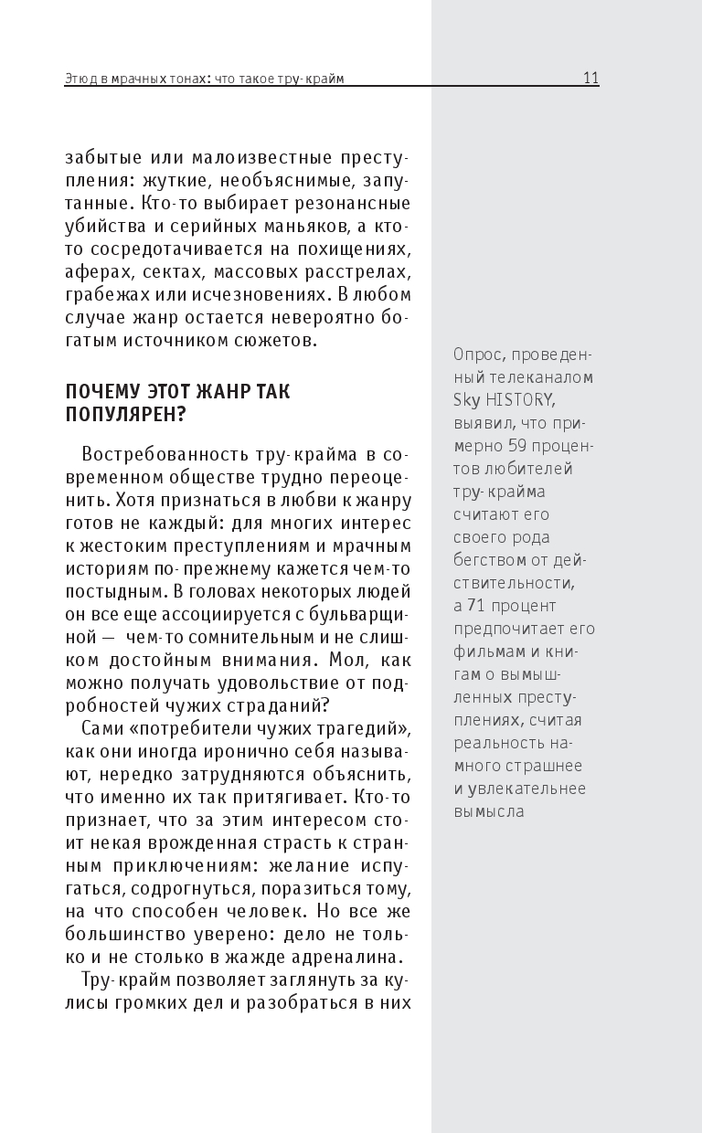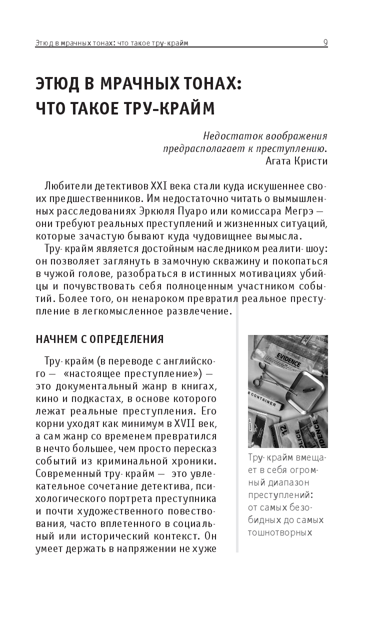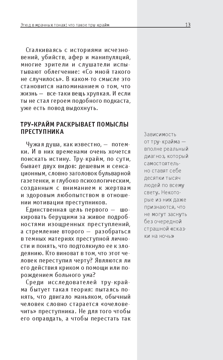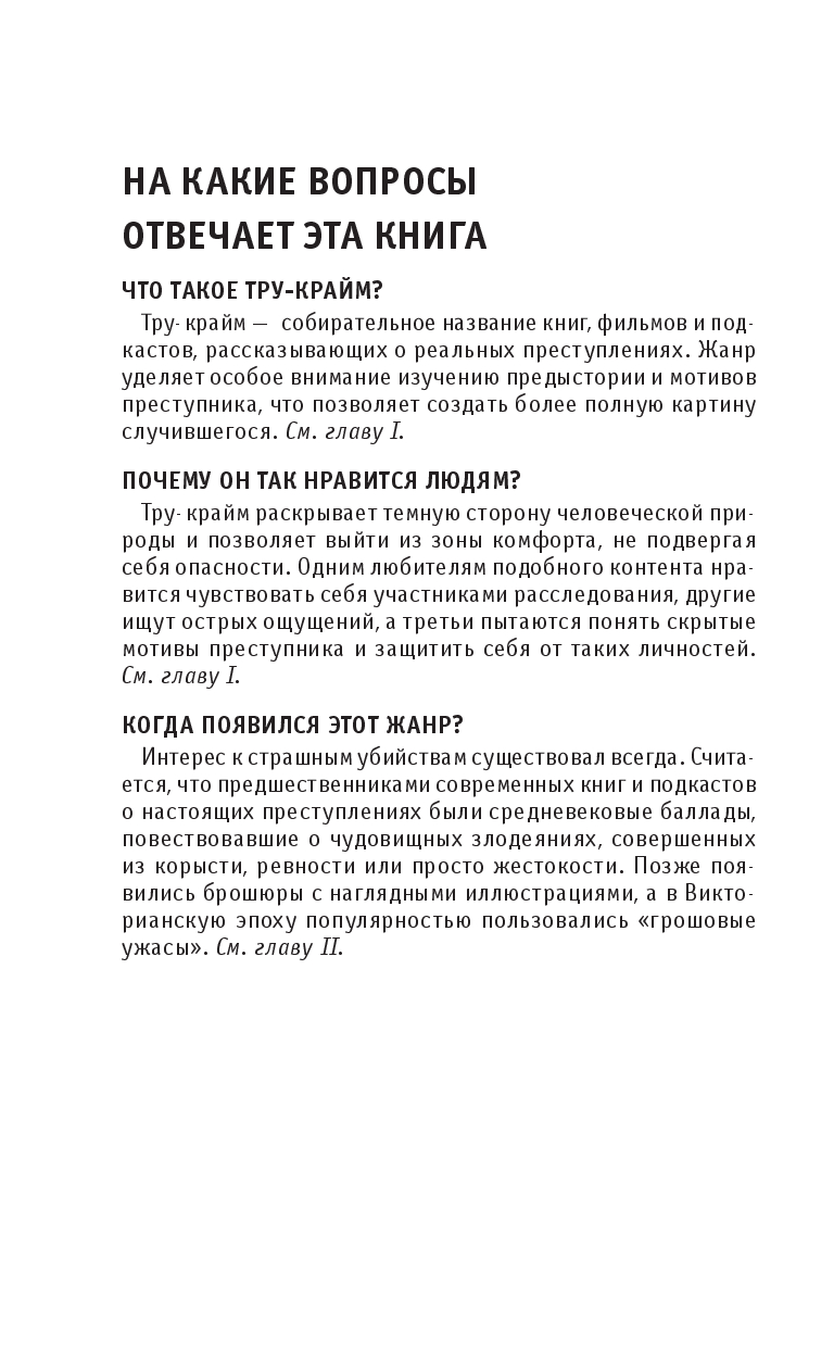 Эта книга поможет разобраться в том, что такое тру-крайм и как он работает: в ней вы найдете краткий обзор истории жанра, узнаете о ключевых делах, послуживших основой для его возникновения, а также познакомитесь с особенностями его форм – от газетных хроник до подкастов. Вы узнаете, как реальные преступления превращаются в культурный феномен и что стоит за желанием людей изучать темную сторону человеческой натуры.