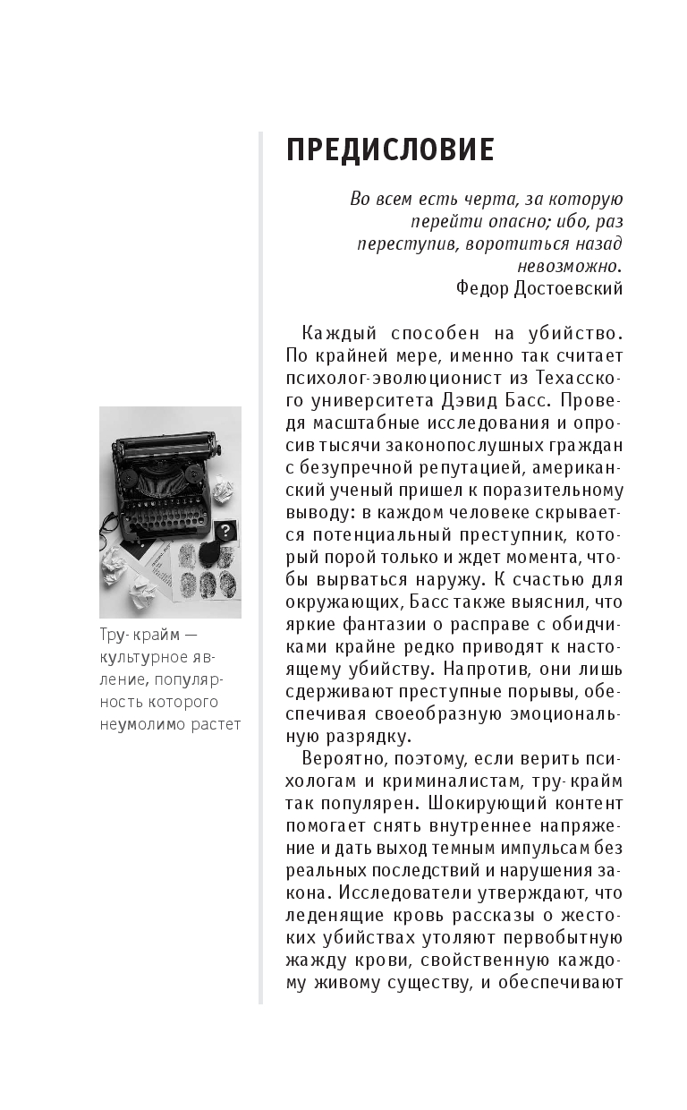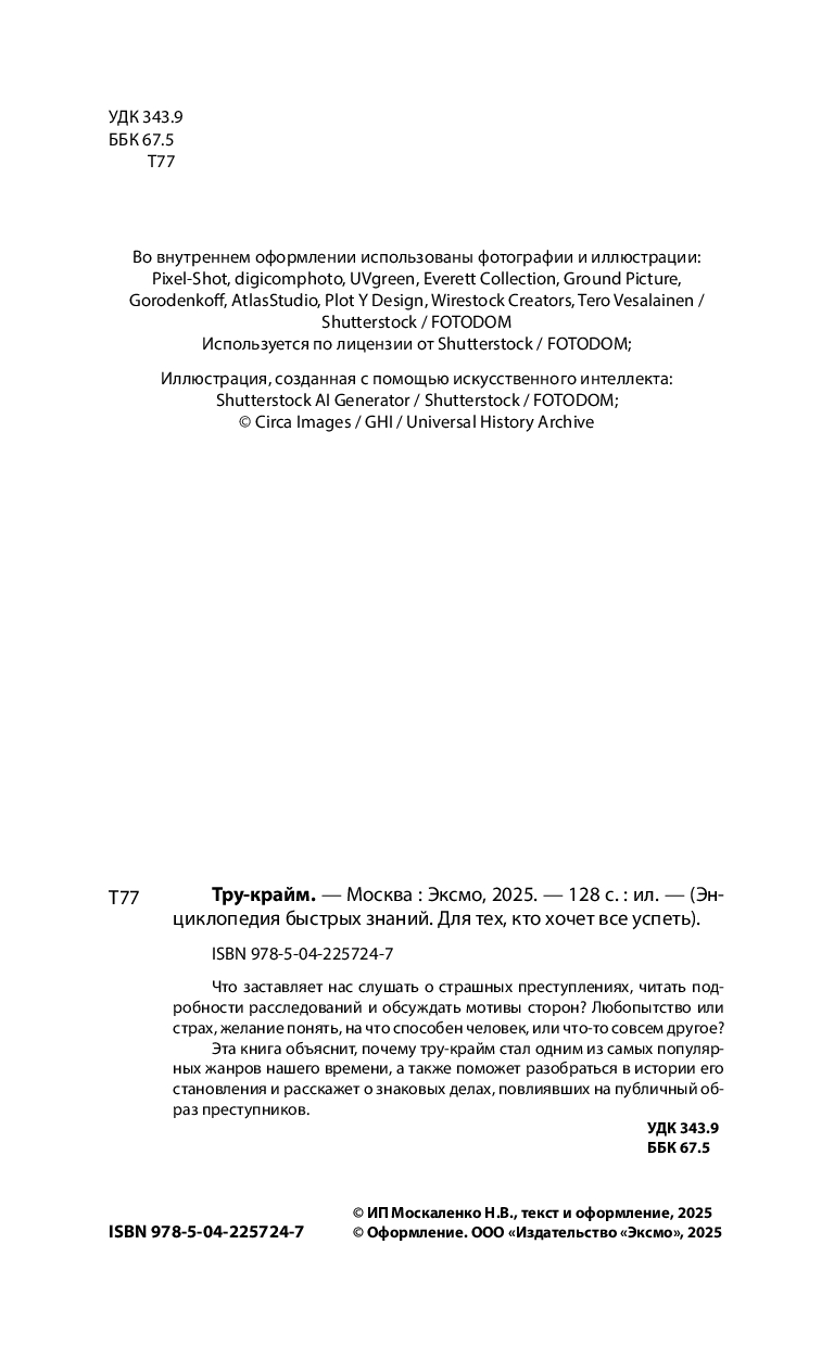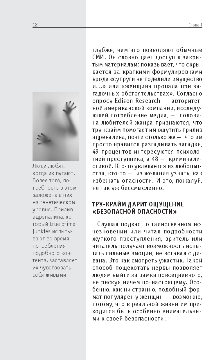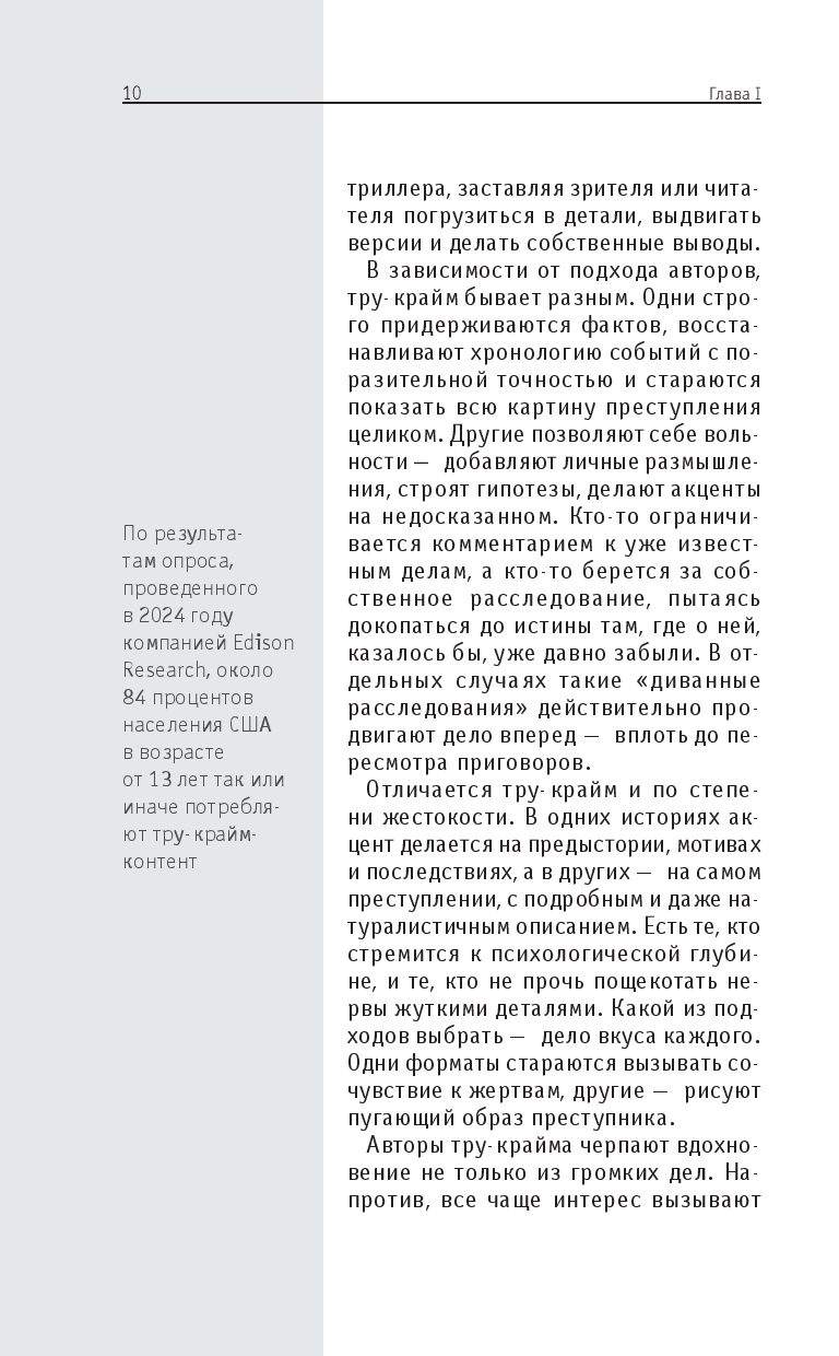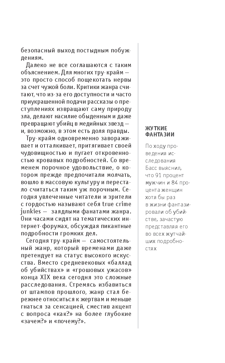 Эта книга поможет разобраться в том, что такое тру-крайм и как он работает: в ней вы найдете краткий обзор истории жанра, узнаете о ключевых делах, послуживших основой для его возникновения, а также познакомитесь с особенностями его форм – от газетных хроник до подкастов. Вы узнаете, как реальные преступления превращаются в культурный феномен и что стоит за желанием людей изучать темную сторону человеческой натуры.