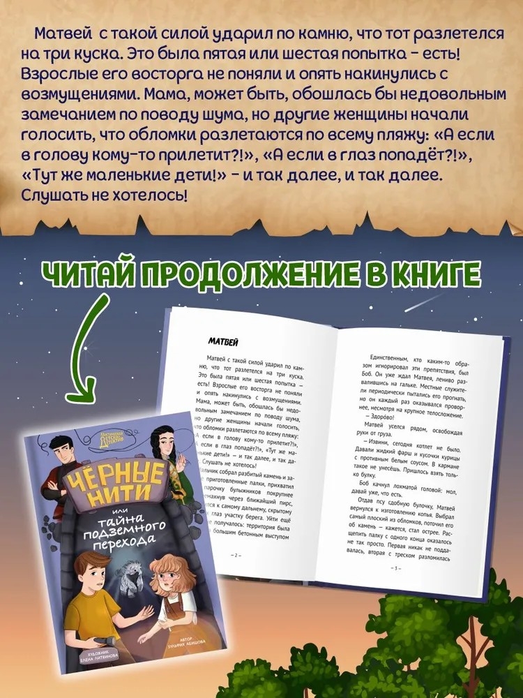 Это взрослые считают, что поездка на море – верх блаженства. А если ты едешь в скучный санаторий в окрестностях сочи с бабушкой, как Кира? Или торчишь в номере из-за ссоры с отцом, как Матвей? Но всё меняется, когда дети знакомятся с огромным лохматым псом и загадочной девушкой в старинном платье: дверь в другой мир, драконы, роскошные фруктовые сады и суровые воины из позапрошлого века сделают эти каникулы незабываемыми! Вот только смогут ли обычные мальчик и девочка распутать магические чёрные нити и вернуться домой?