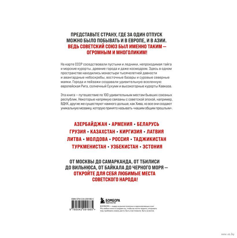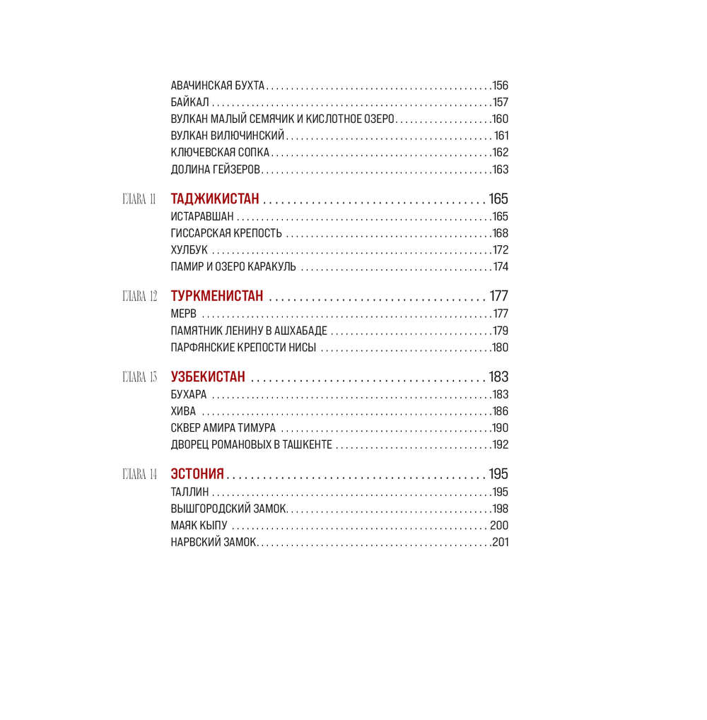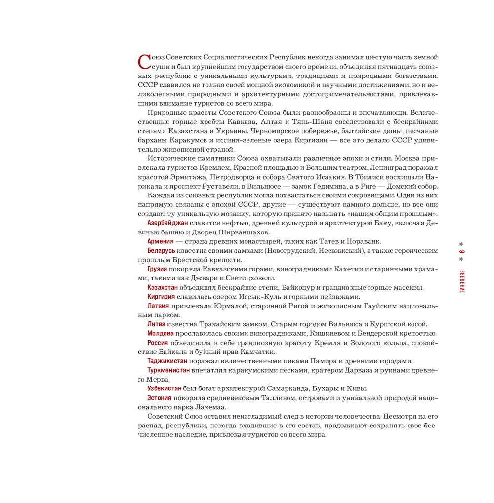 Эта книга – захватывающее приключение по стране, оставившей грандиозный след в культуре, архитектуре и сознании миллионов людей. Вас ждут самые красивые и удивительные места – от ледяных просторов Памира до величественных мавзолеев Узбекистана, от таинственных крепостей Кавказа до легендарной ВДНХ в сердце Москвы.
