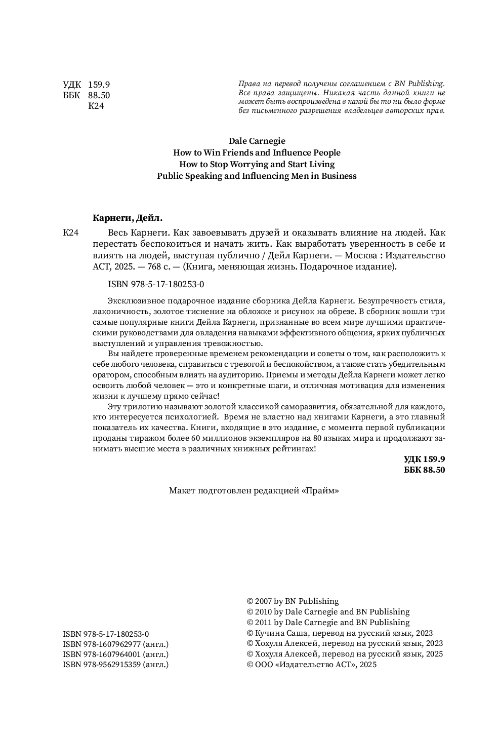 Эксклюзивное издание сборника Дейла Карнеги с цветным обрезом станет прекрасным подарком и украшением домашней библиотеки. Издание включает в себя три самые популярные книги Дейла Карнеги, признанные во всем мире лучшими практическими руководствами для овладения навыками эффективного общения, ярких публичных выступлений и управления тревожностью.