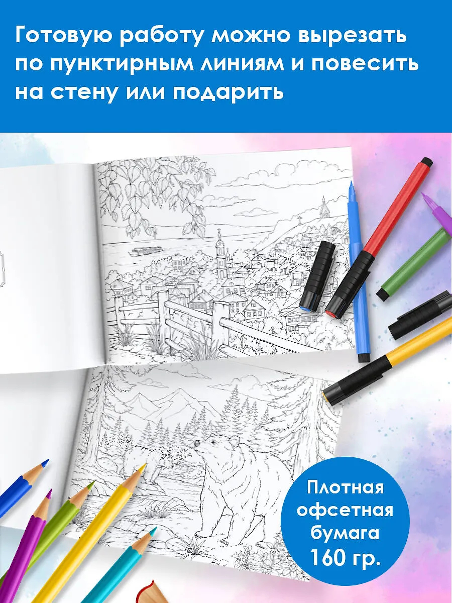 На этих страницах на плотной бумаге вас ждут знаменитые символы и скрытые жемчужины нашей Родины, которые можно раскрашивать карандашами, фломастерами и даже красками. А после – вырезать по пунктиру и подарить друзьям или повесить на стену.
