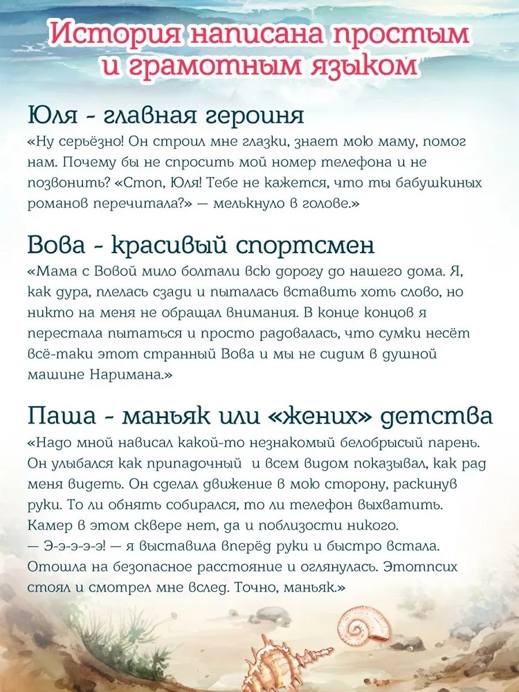 "Меня зовут Юля, и это лето я проведу на море у своей мамы. Мы видимся редко, потому что учусь и живу я в Москве вместе с бабушкой и дедушкой. В общем, это долгая история… Вот только на вокзале меня ждал неприятный сюрприз. Вместо мамы меня встретил её "друг", который, судя по всему, частый гость в её доме.