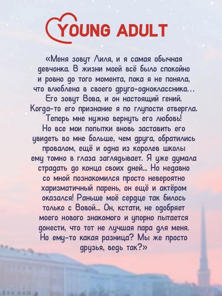 "Меня зовут Лиля, и я самая обычная девчонка. В жизни моей всё было спокойно и ровно до того момента, пока я не поняла, что влюблена в своего друга-одноклассника… Его зовут Вова, и он настоящий гений. Когда-то его признание я по глупости отвергла.