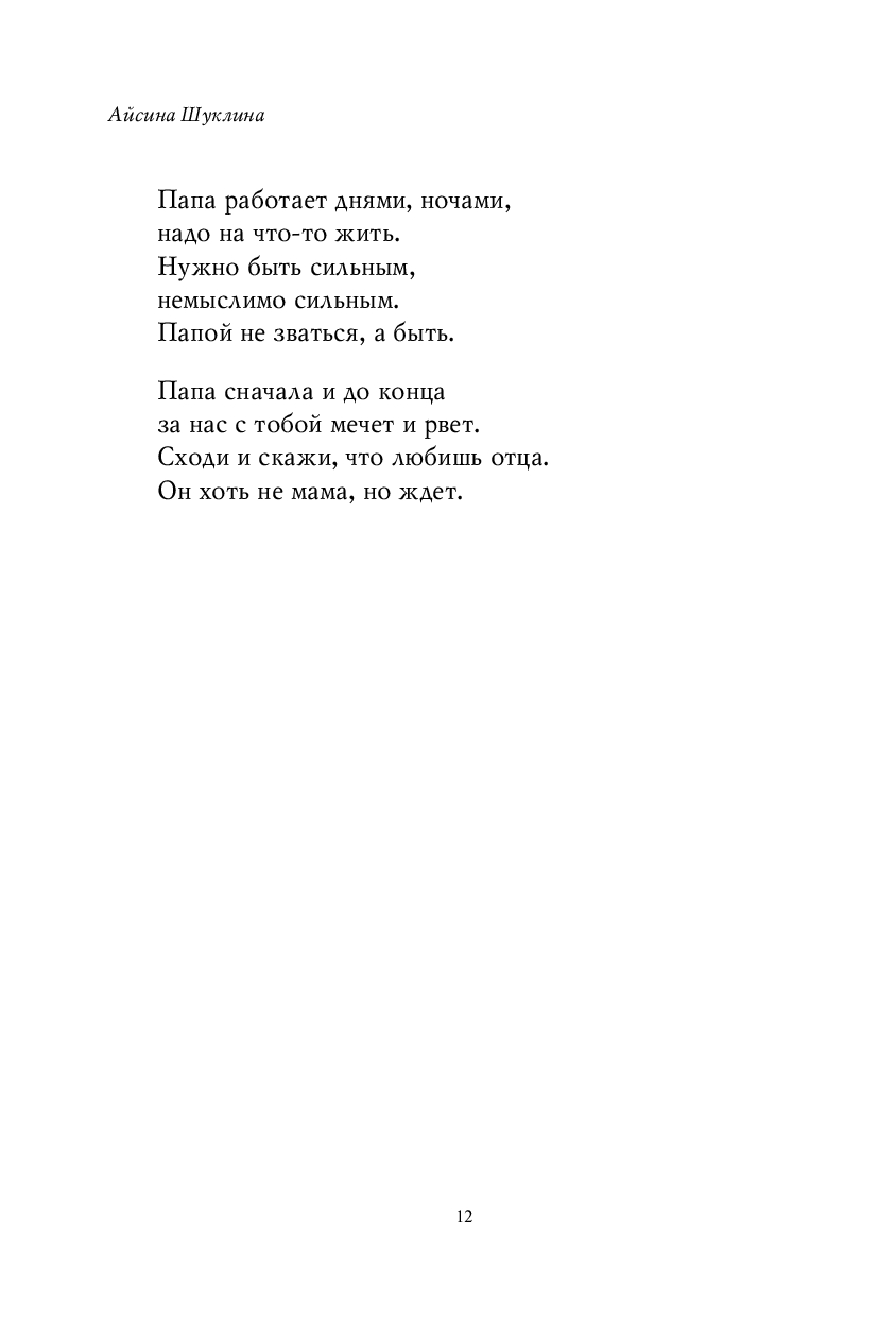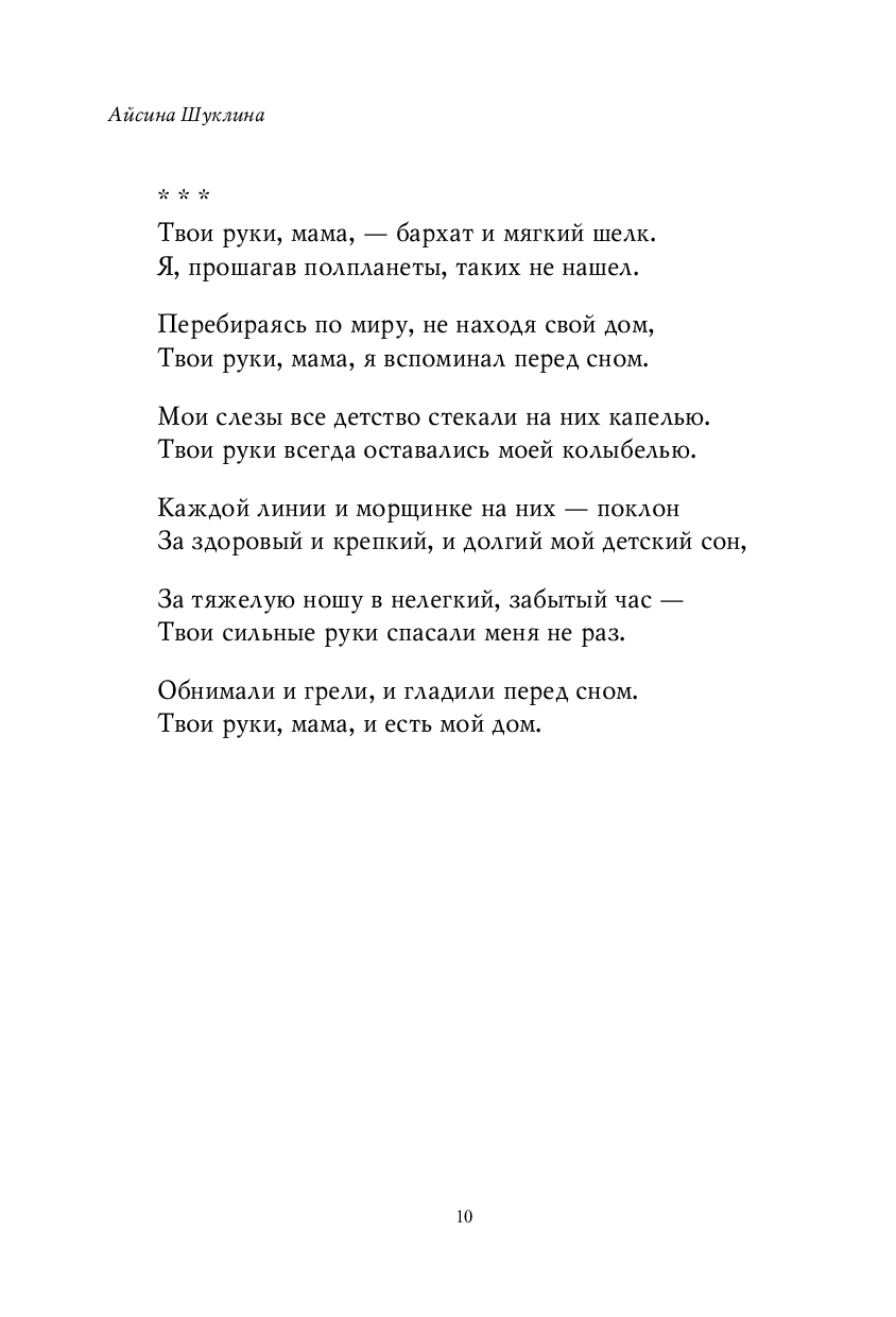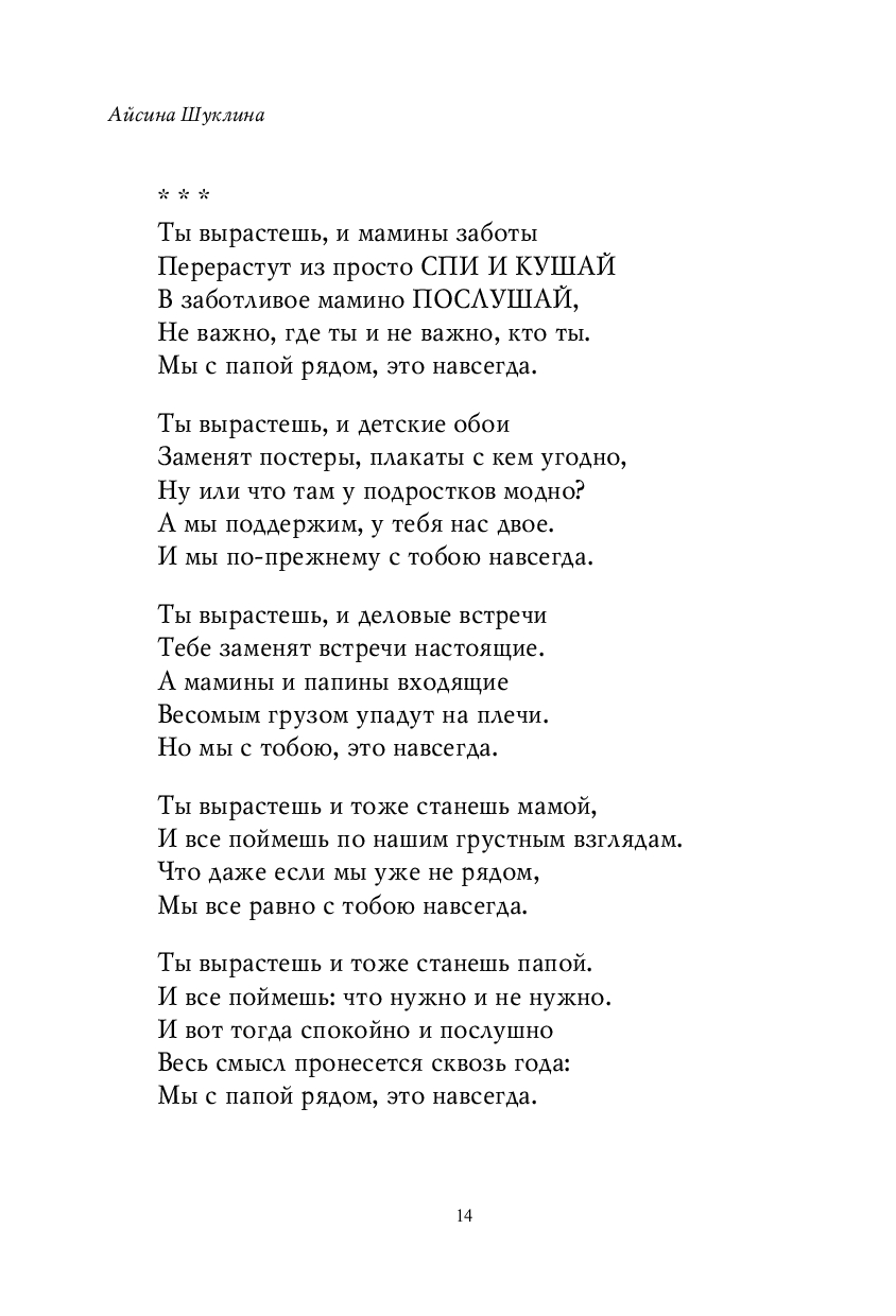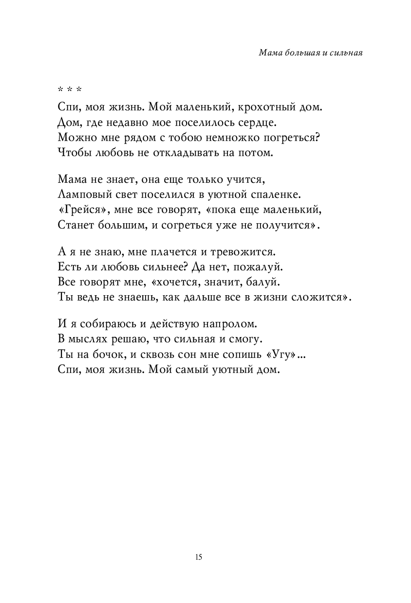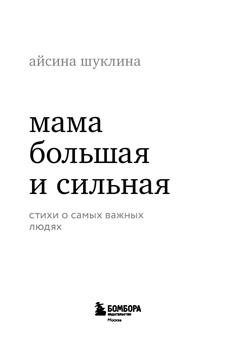 Сборник Айсины Шуклиной "Мама большая и сильная" – это трогательные и искренние стихи о самом главном: о семье и детстве, о мамах и папах, бабушках и дедушках, о любви и трепетных чувствах. Они возвращают нас к жизненным истинам: мама – это дом, папа – это сила, семья – это навсегда. Узнаваемые ситуации и простые, но бесконечно важные слова, которые хочется перечитывать снова и снова.