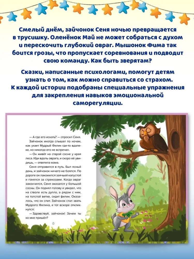 Смелый днём, зайчонок Сеня ночью превращается в трусишку. Оленёнок Май не может собраться с духом и перескочить глубокий овраг. Мышонок Фима так боится грозы, что пропускает соревнования и подводит свою команду. Как быть зверятам? Сказки, написанные психологами, помогут детям узнать о том, как можно справиться со страхом. К каждой истории подобраны специальные упражнения для закрепления навыков эмоциональной саморегуляции.