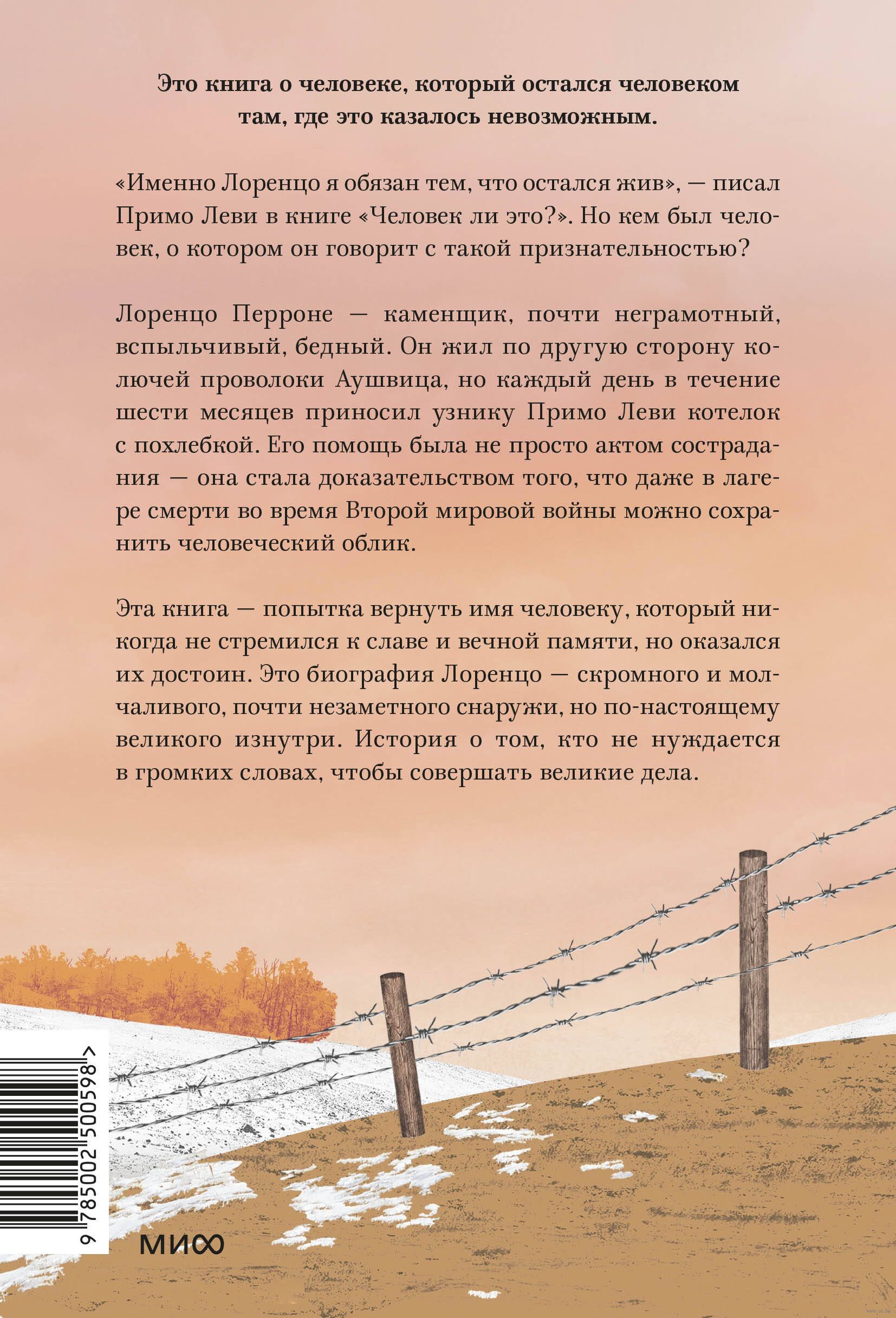 Лоренцо Перроне – каменщик, почти неграмотный, вспыльчивый, бедный. Он жил по другую сторону колючей проволоки Аушвица, но каждый день в течение шести месяцев приносил узнику Примо Леви котелок с похлебкой. Его помощь была не просто актом сострадания, она стала доказательством того, что даже в лагере смерти во время Второй мировой войны можно сохранить человеческий облик.