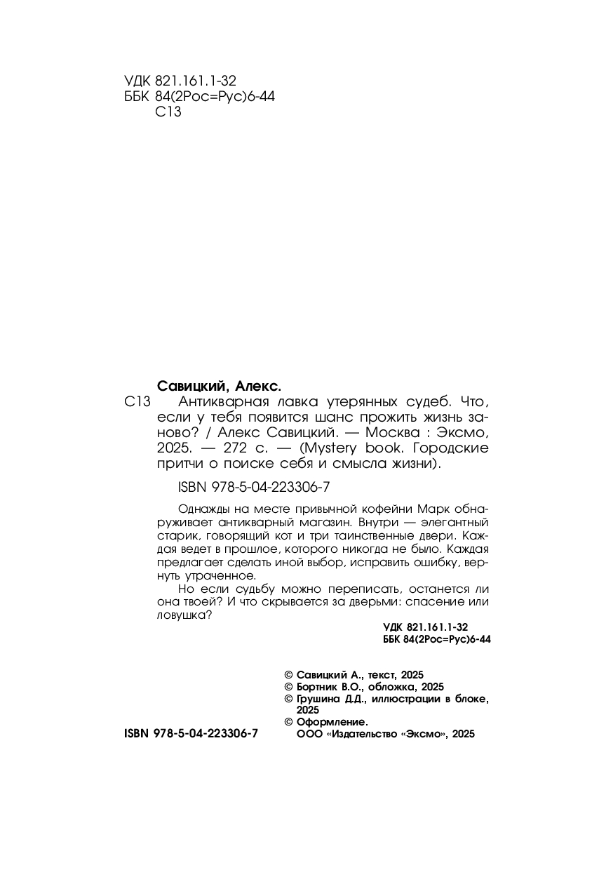 Однажды на месте привычной кофейни Марк обнаруживает антикварный магазин. Внутри – элегантный старик, говорящий кот и три таинственные двери. Каждая ведет в прошлое, которого никогда не было. Каждая предлагает сделать иной выбор, исправить ошибку, вернуть утраченное.