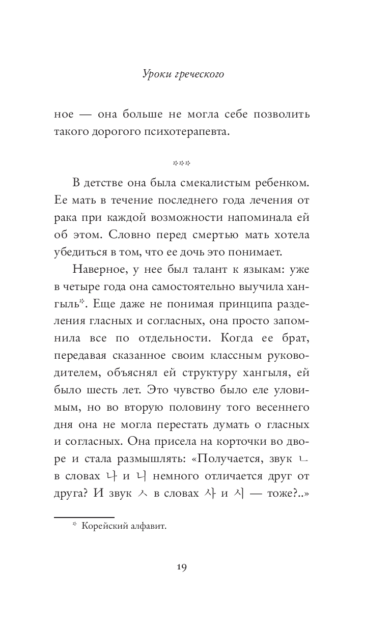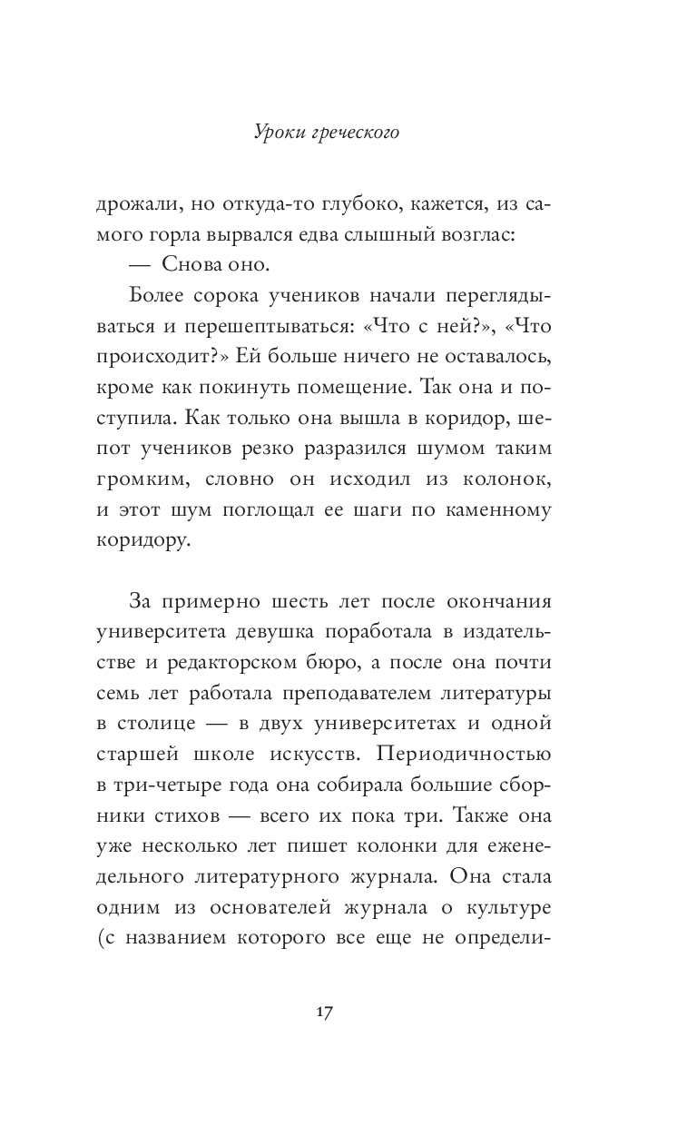 "Уроки греческого" рассказывают историю двух обычных людей, встретившихся в момент личной боли и потери для каждого из них. Угасающий свет в глазах мужчины, теряющего зрение, встречается с молчанием женщины, потерявшей способность говорить. Но именно эти обстоятельства сближают их. Постепенно герои открывают внутри себя глубокое чувство единения – их внутренние голоса переплетаются с поразительной красотой, пока они рука об руку двигаются от тьмы безысходности к свету надежды, от тишины к негромкому дыханию и выражению своего внутреннего я. "Уроки греческого" – роман, помогающий осознать ценность чувств и ощущений и ценность бытия.