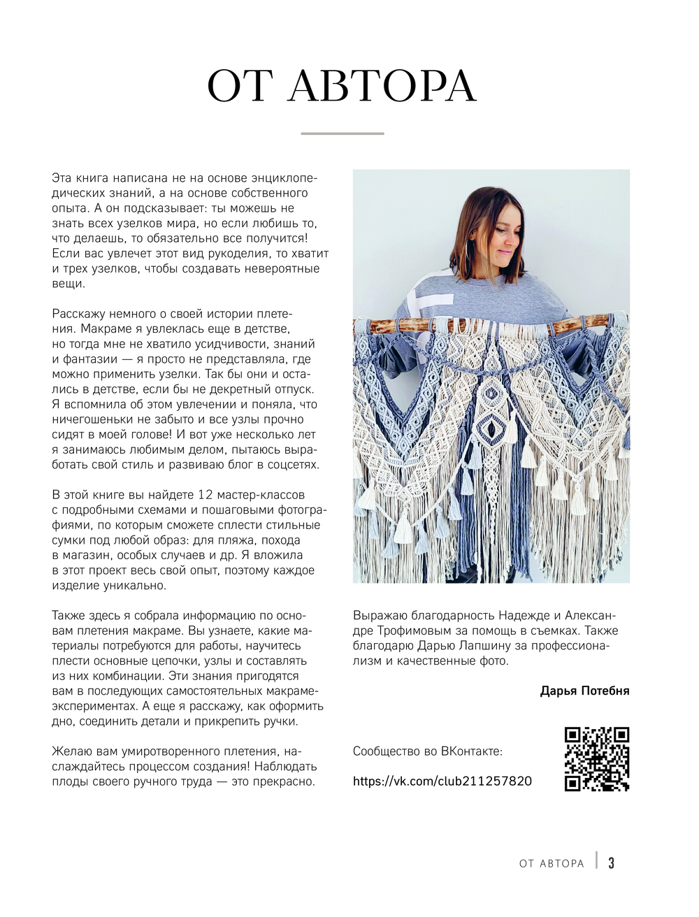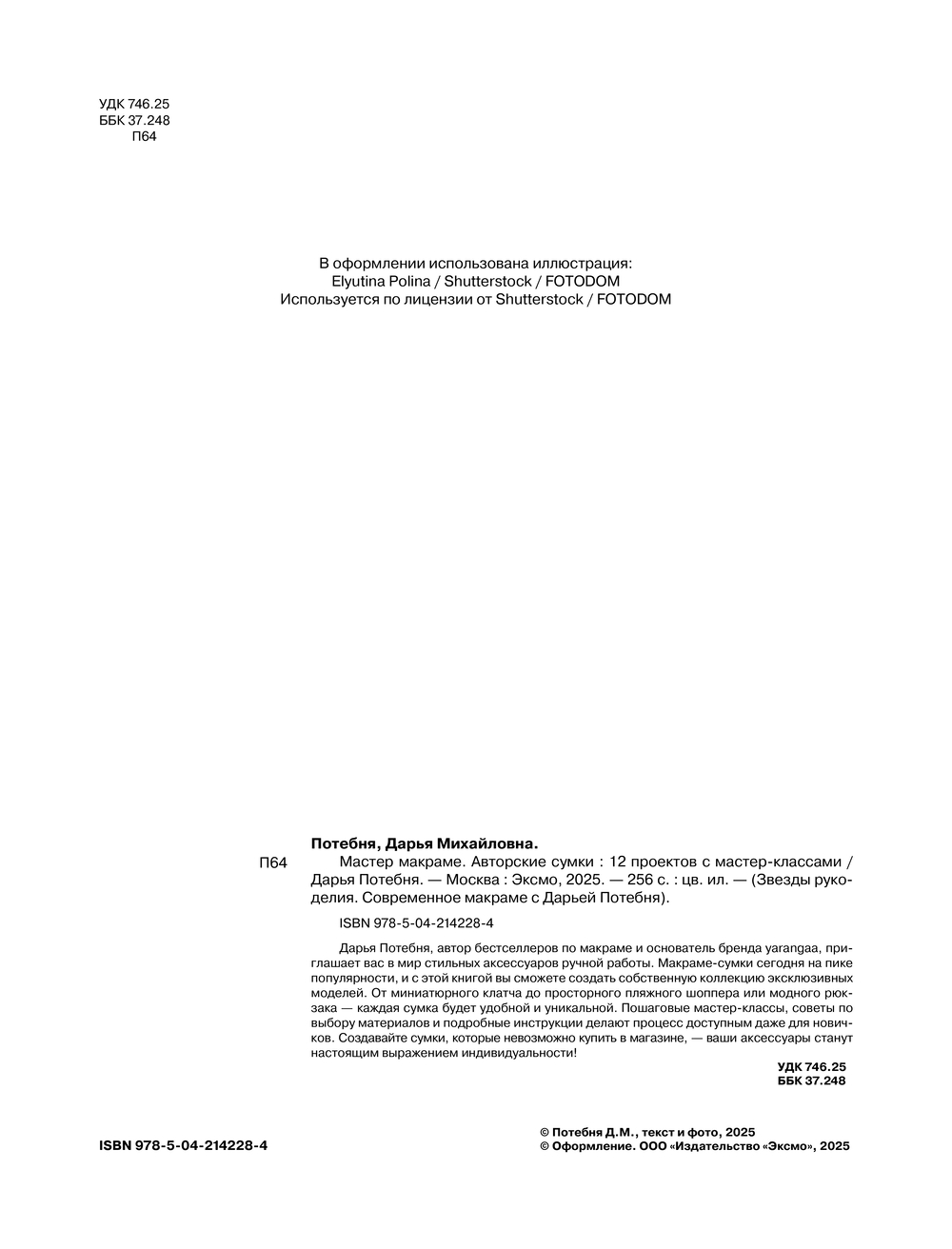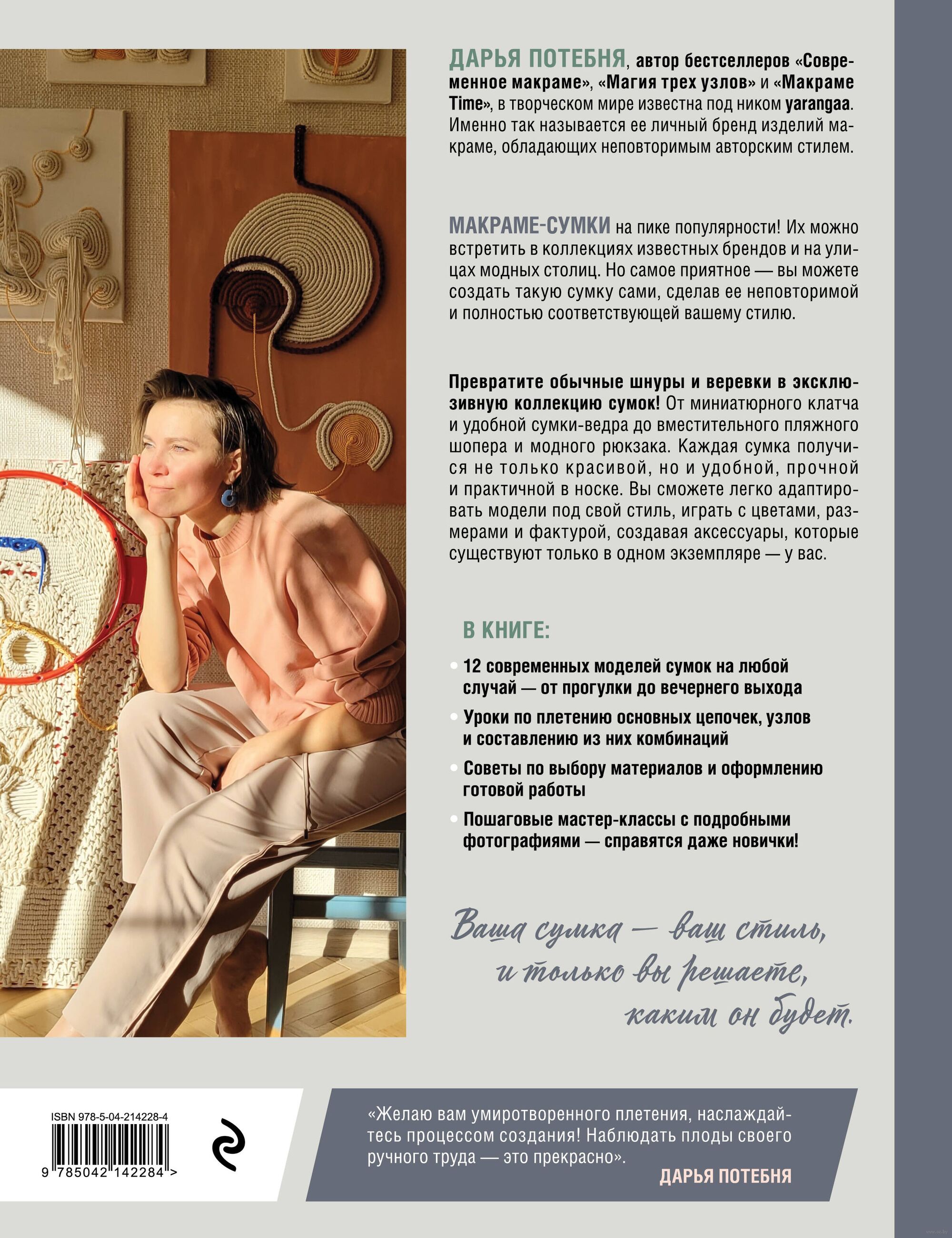 Дарья Потебня, автор бестселлеров по макраме и основатель бренда yarangaa, приглашает вас в мир стильных аксессуаров ручной работы. Макраме-сумки сегодня на пике популярности, и с этой книгой вы сможете создать собственную коллекцию эксклюзивных моделей. От миниатюрного клатча до просторного пляжного шоппера или модного рюкзака – каждая сумка будет удобной и уникальной. Пошаговые мастер-классы, советы по выбору материалов и подробные инструкции делают процесс доступным даже для новичков. Создавайте сумки, которые невозможно купить в магазине – ваши аксессуары станут настоящим выражением индивидуальности!