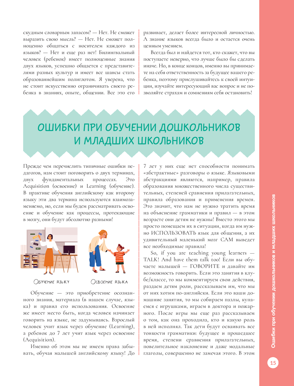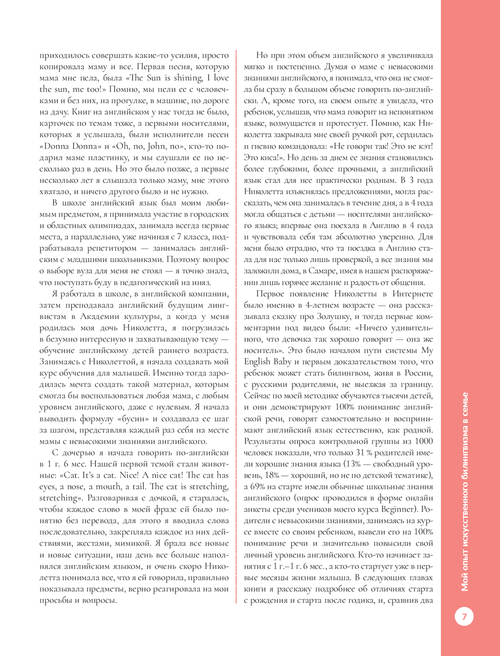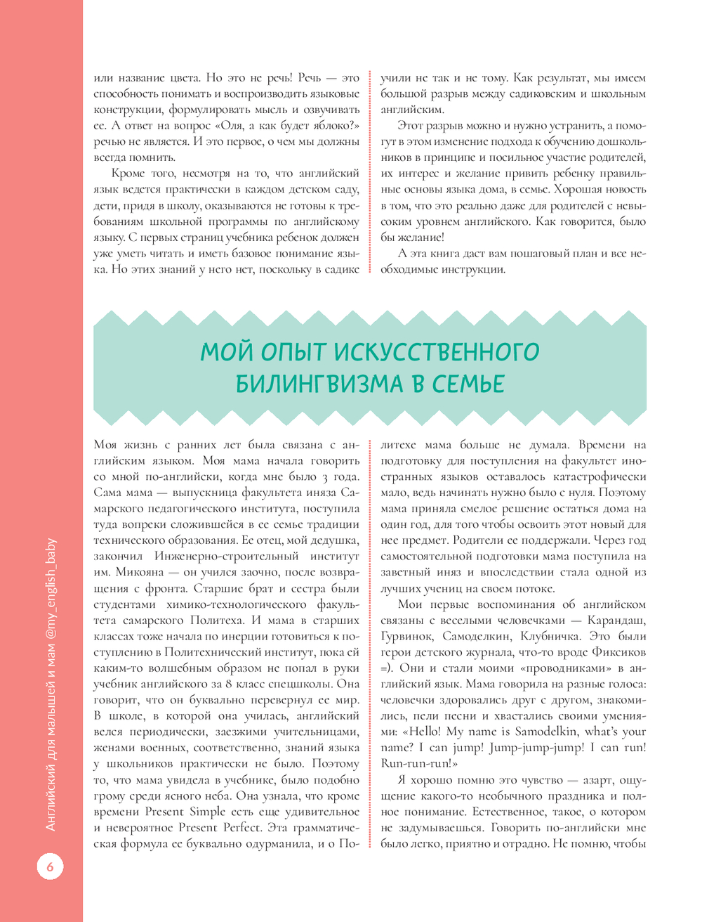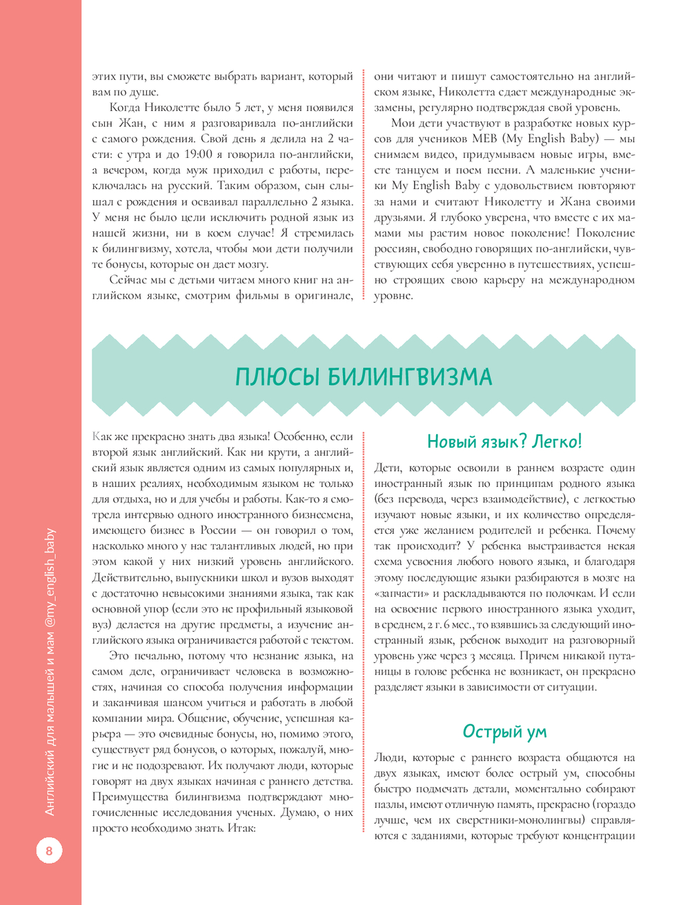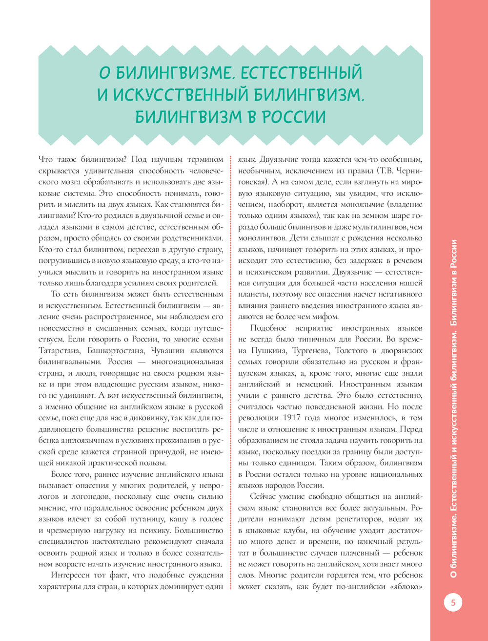 Что такое билингвизм? Как становятся билингвами? Для чего нужно учить английский язык с самого рождения и с чего начать? Эта книга даст ответы на эти и многие другие вопросы, которые нередко волнуют родителей, любящих своих детей и готовых к раннему развитию малышей, саморазвитию и гармоничному воспитанию.