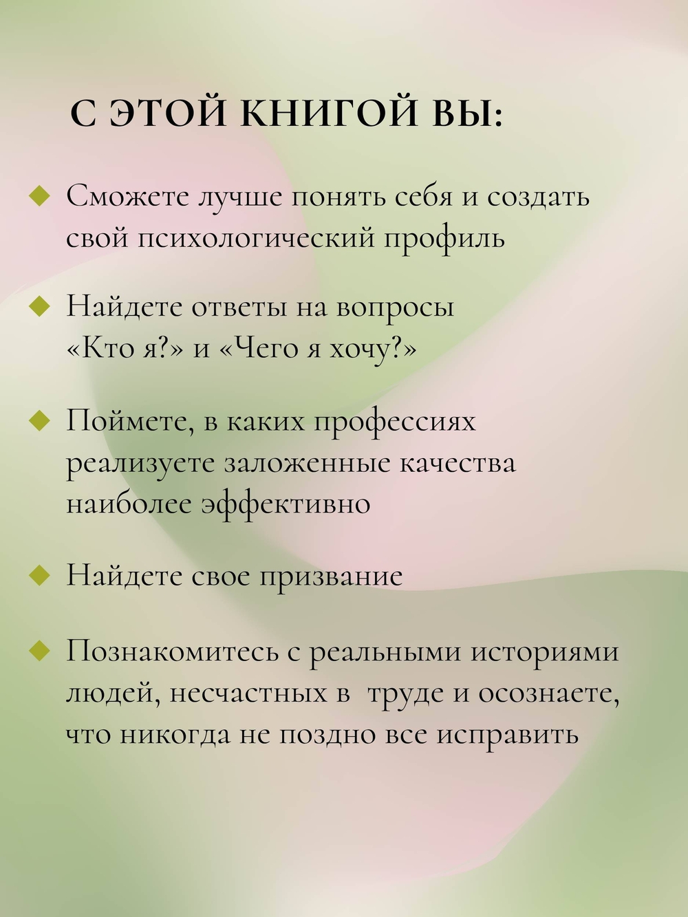 Правильный выбор профессиональной деятельности является одним из ключевых факторов жизненной реализации и внутреннего благополучия. В своей новой книге автор предлагает системный подход к решению данного вопроса, который помогает в полной мере раскрыть свой потенциал и добиться подлинной компетентности. Когда человек занимается своим делом, это выходит далеко за рамки карьеры, формируя общее ощущение счастья и гармонии в жизни.