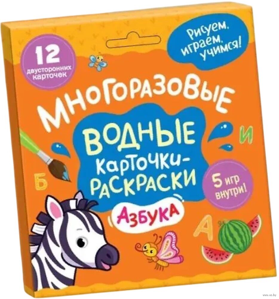 Для игры не нужны ни карандаши, ни краски специальное покрытие меняет цвет при взаимодействии с водой, а после высыхания картинку можно раскрашивать снова!На лицевой стороне отгадывайте загадки и раскрашивайте картинки. На оборотной стороне отвечайте на вопросы и запоминайте буквы. Правильно подбирать карточки помогут пиктограммы.