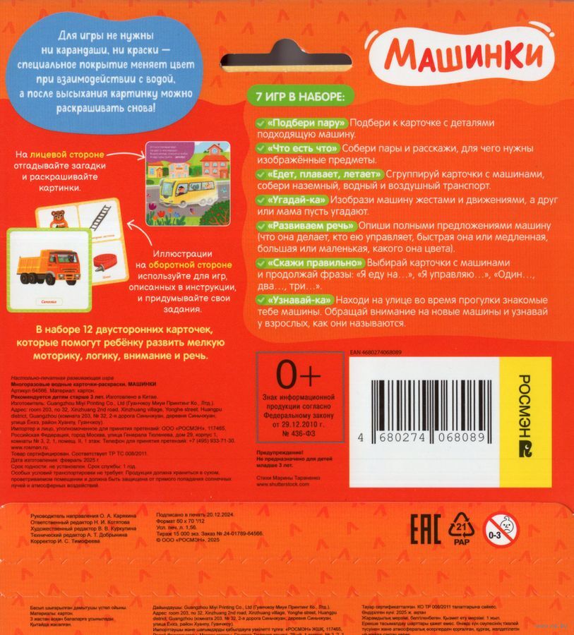 В наборе 12 двусторонних карточек, которые помогут ребенку развить мелкую моторику, логику, внимание и речь.