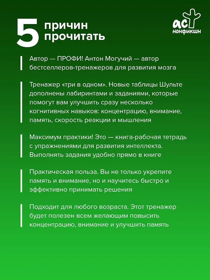 Совместите приятное с полезным – регулярно тренируйте свой мозг и интересно проводите время! Этот тренажер в формате "три в одном" – новая комбинация упражнений от Антона Могучего!