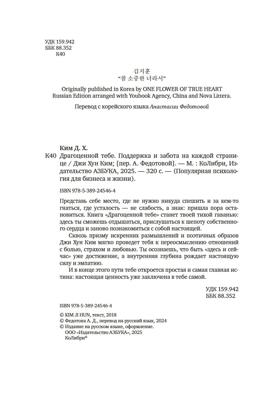 В мире, который постоянно диктует, какими мы "должны" быть, так легко забыть о своей уникальной ценности. "Драгоценной тебе" – корейская книга-бестселлер – твой личный тихий уголок поддержки, заботы и принятия.