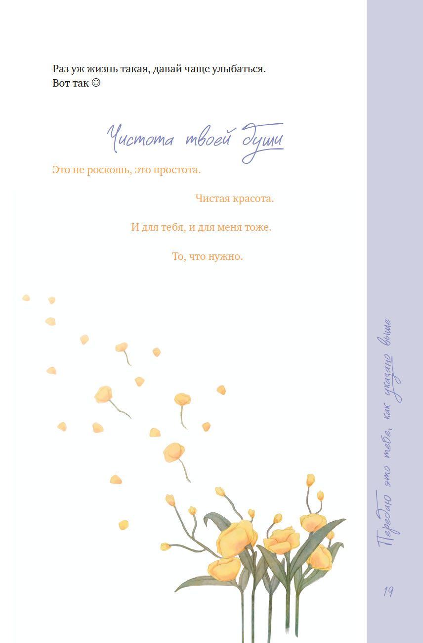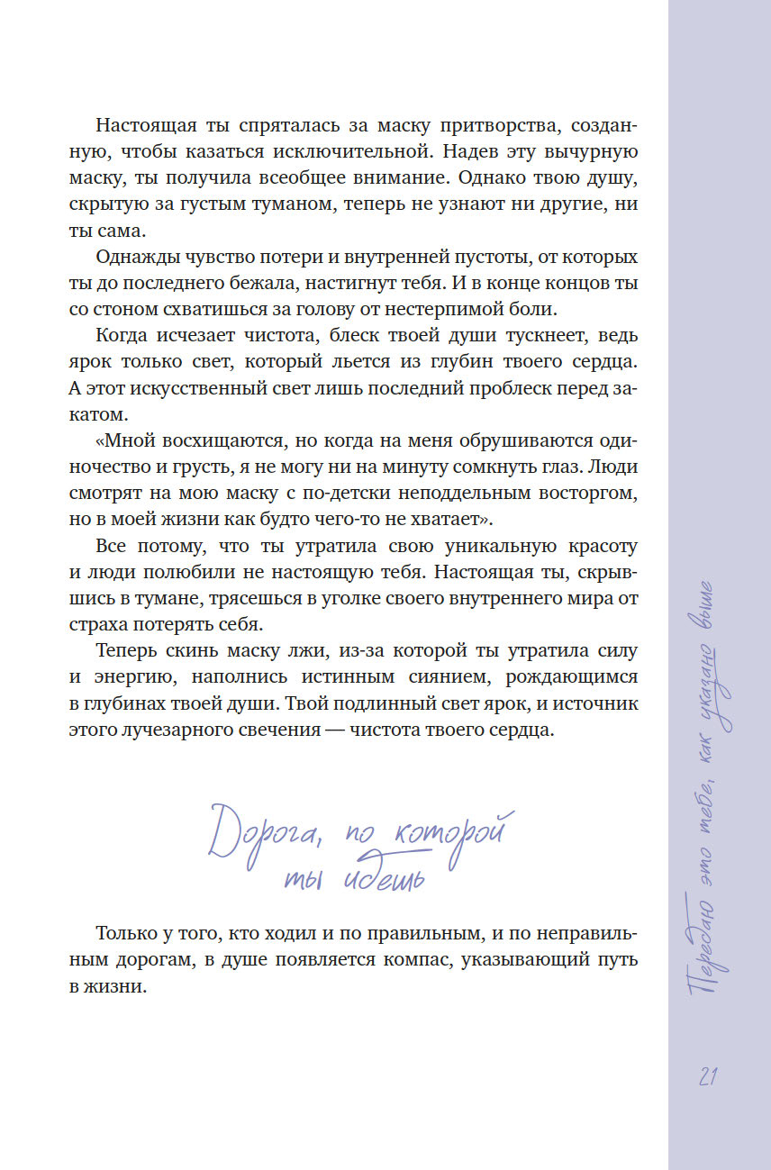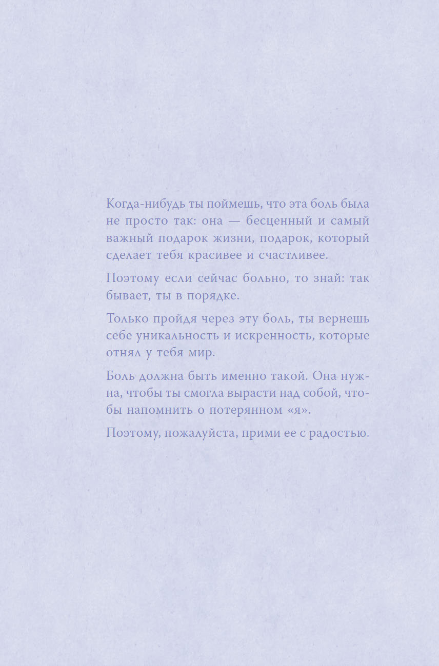 Перестань жить в погоне за чужими идеалами и одобрением окружающих. Научись ценить свою уникальность и найди тихое счастье в моменте "здесь и сейчас". Обрети внутреннюю опору и помни: ты уже достойна любви и той жизни, которую хочешь.