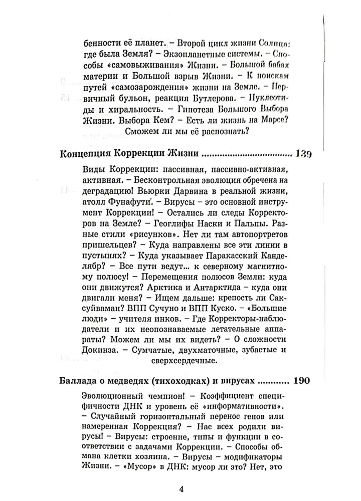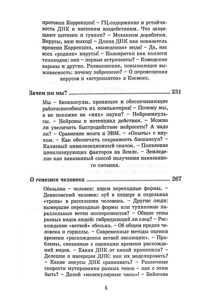 "Происхождение видов" – попытка метафизического осмысления сложности устройства и поразительного разнообразия Жизни. Автор говорит об эволюции как о корректируемой деградации видов. Разнообразие видов – это результат многоуровневой Коррекции – пассивной, пассивно-активной и активной. Рассматривая структуру и размеры ДНК разных видов, автор находит объяснение существованию в ней "мусорных" участков, смыслу наличия интронов наряду с экозонами. Все это – элементы протоколов Коррекции, главным инструментом которой являются вирусы. Рассматривая генезис человека как биологического вида, автор рассуждает о возможной главной цели "выведения" человека.